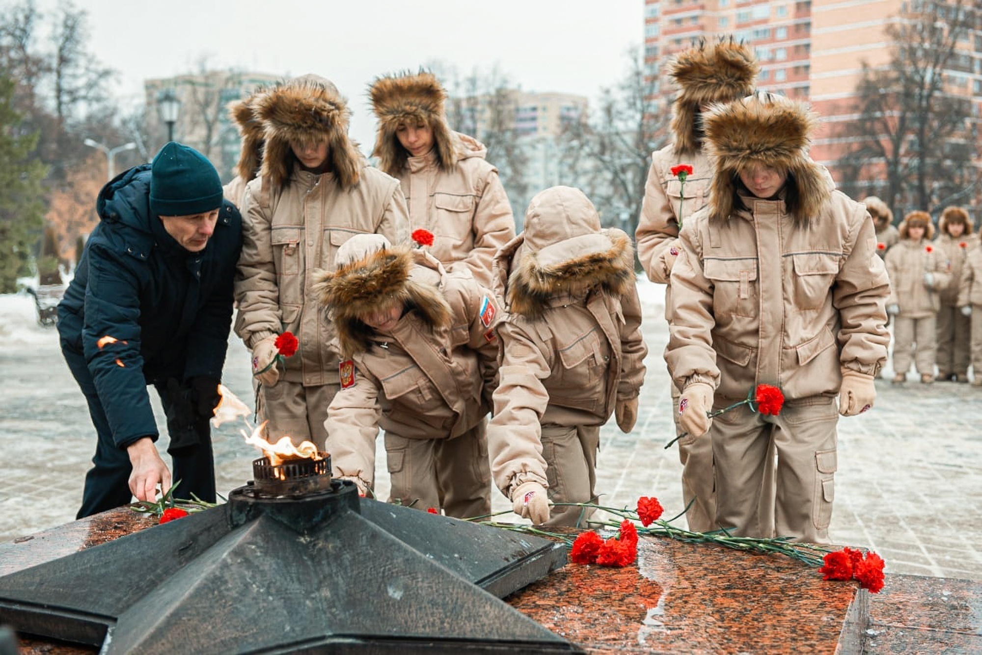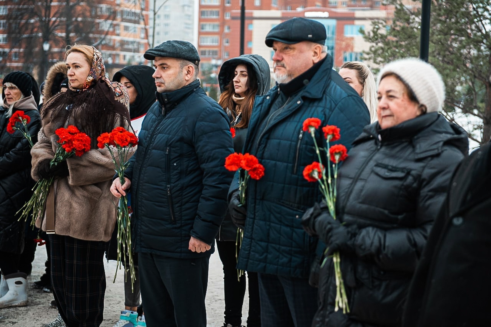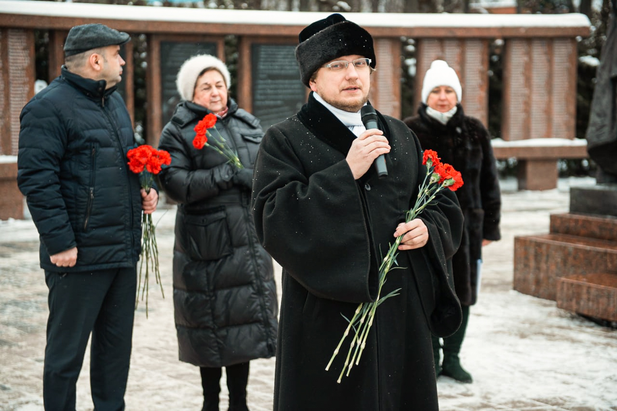 Ученики школ, представители администрации округа, добровольцы, священнослужители возложили цветы и почтили память павших минутой молчания.