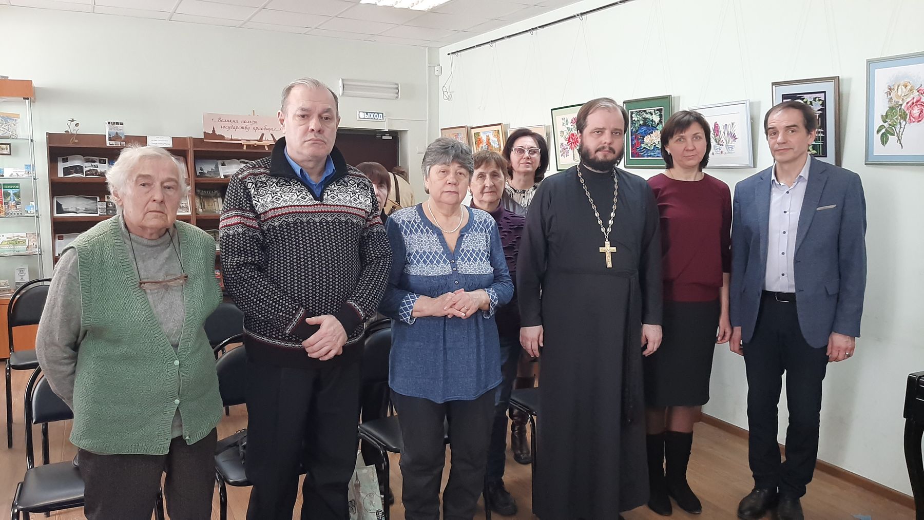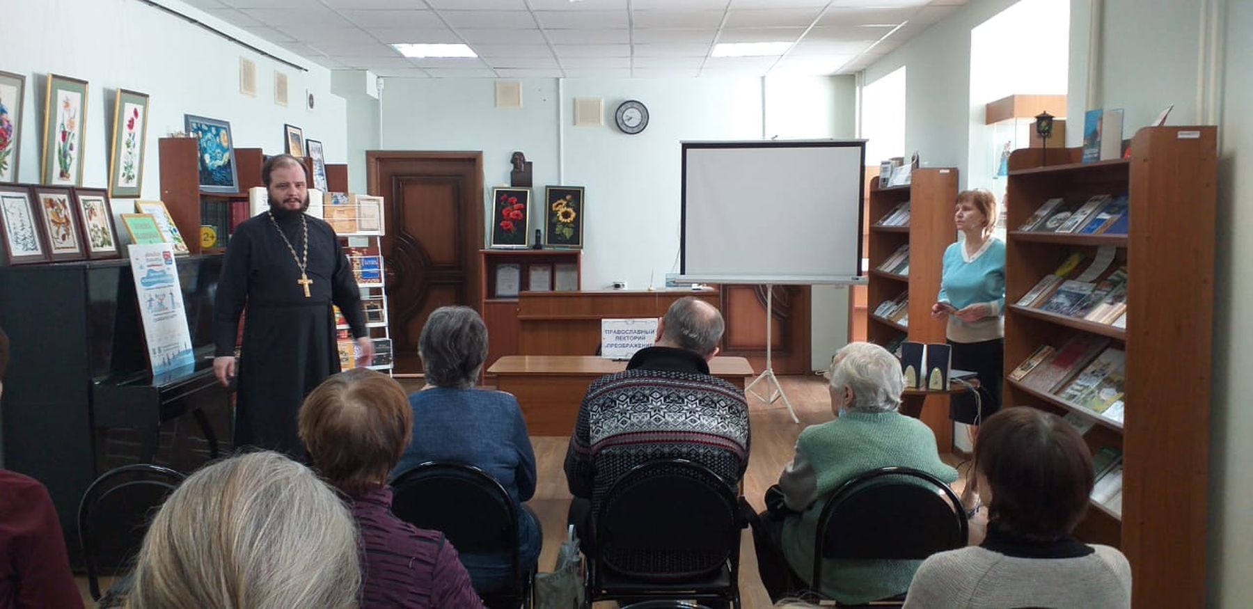 Встреча началась с просмотра документального фильма «Война и вера», участвующего в первом общероссийском передвижном фестивале «Кино на службе Отечества». Фильм рассказывает о священнослужителях, совершавших командировки в зону специальной военной операции.