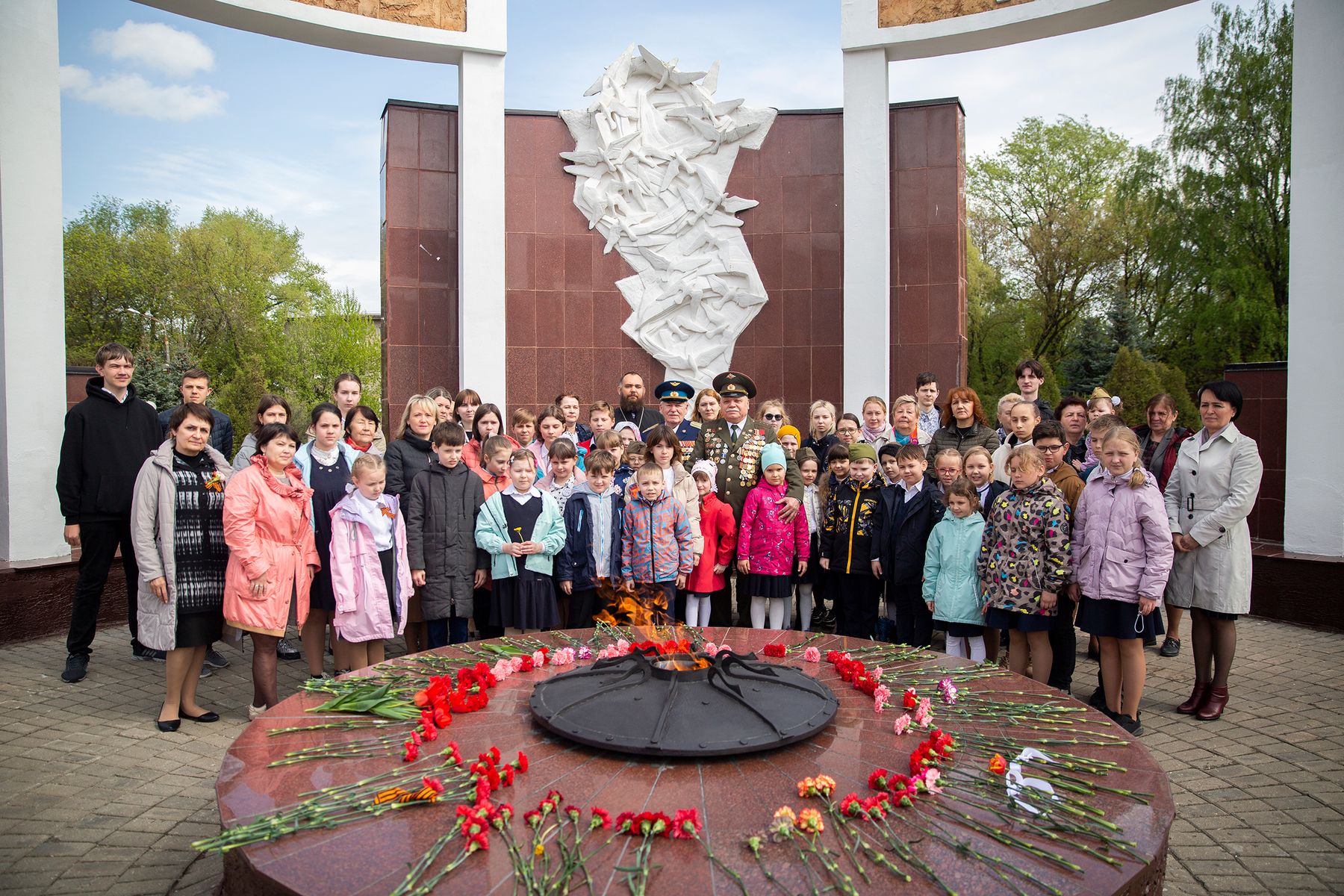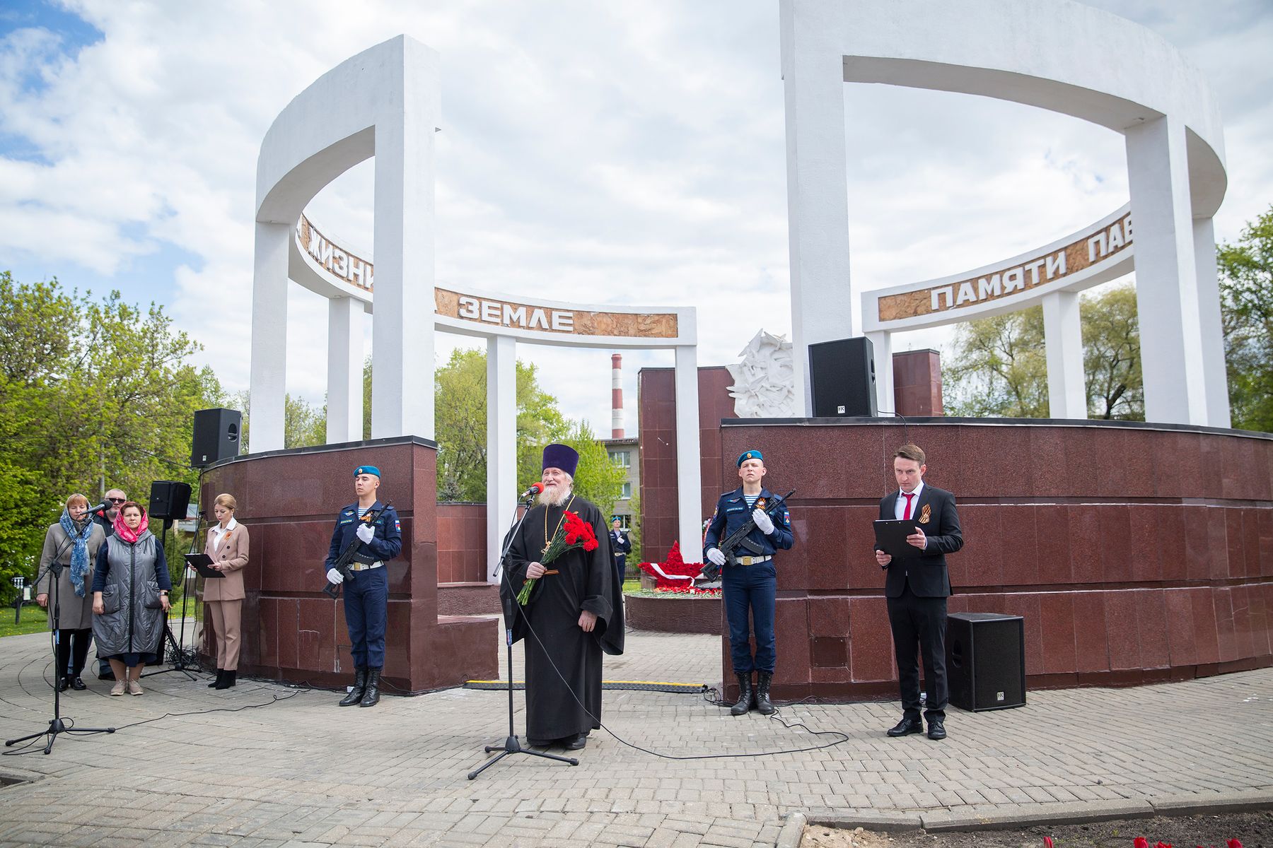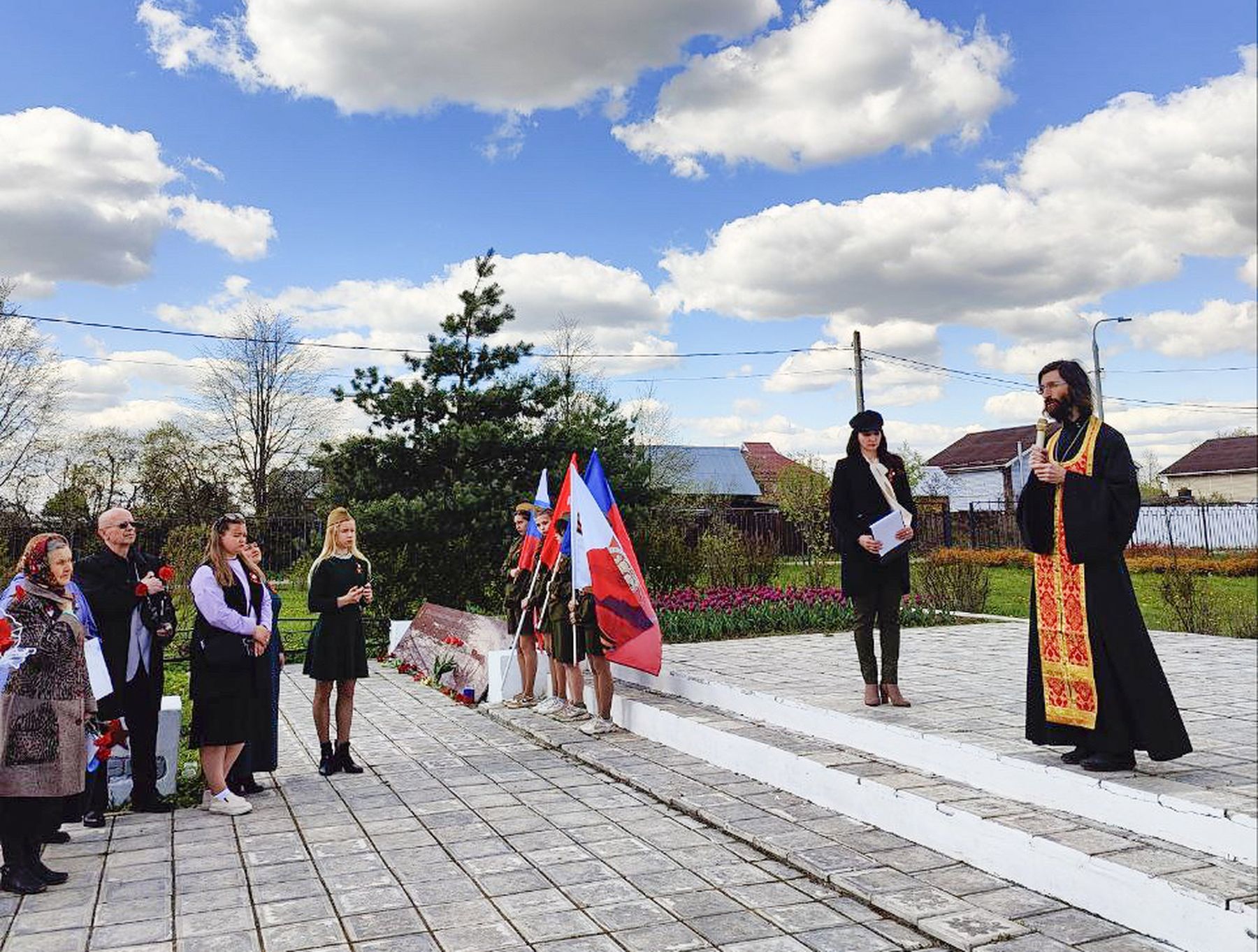 Отец Виталий поздравил присутствующих с Днём Победы и провозгласил Вечную память всем погибшим за Родину в годы Великой Отечественной войны, после чего к стеле были возложены венки и цветы.