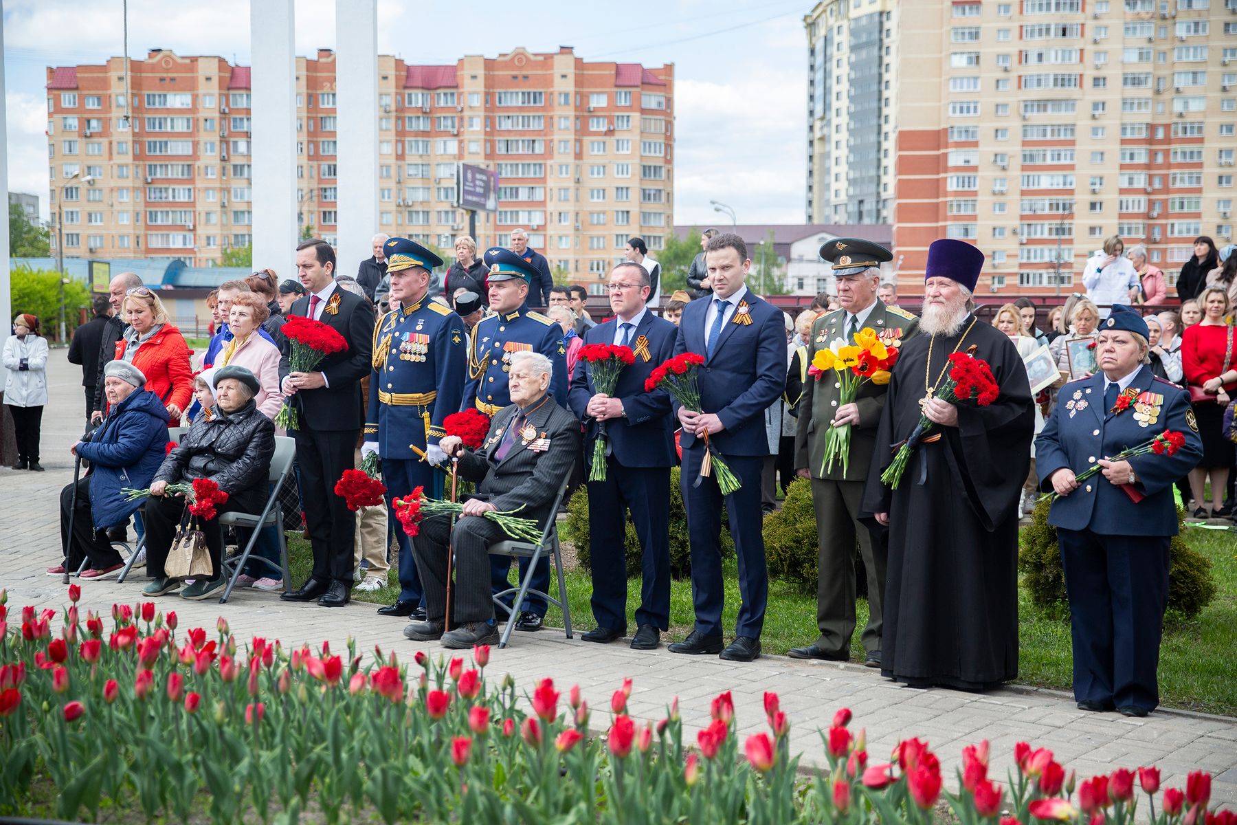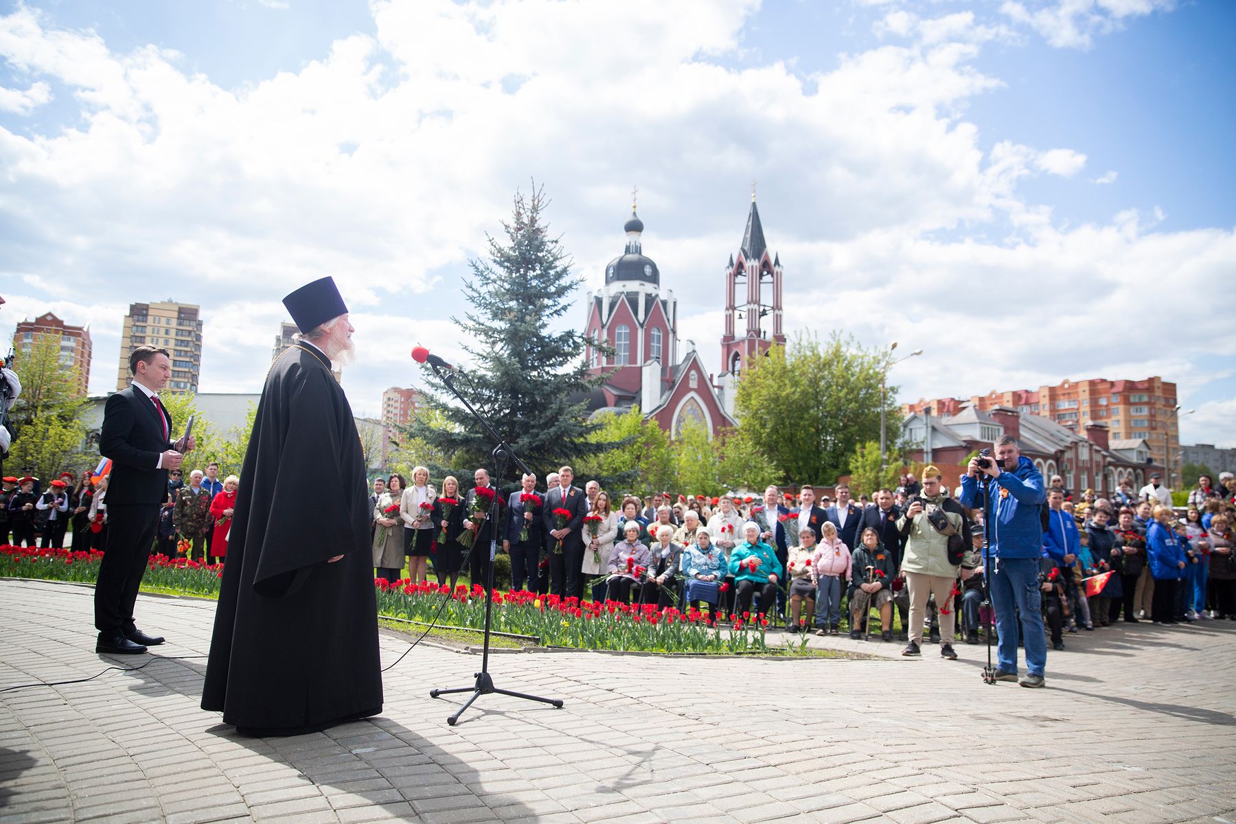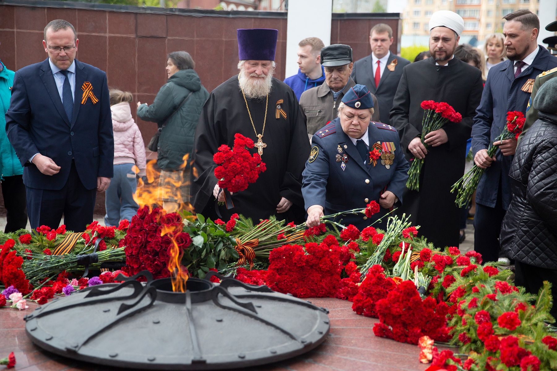 Отец Виталий поздравил присутствующих с Днём Победы и провозгласил Вечную память всем погибшим за Родину в годы Великой Отечественной войны, после чего к стеле были возложены венки и цветы.