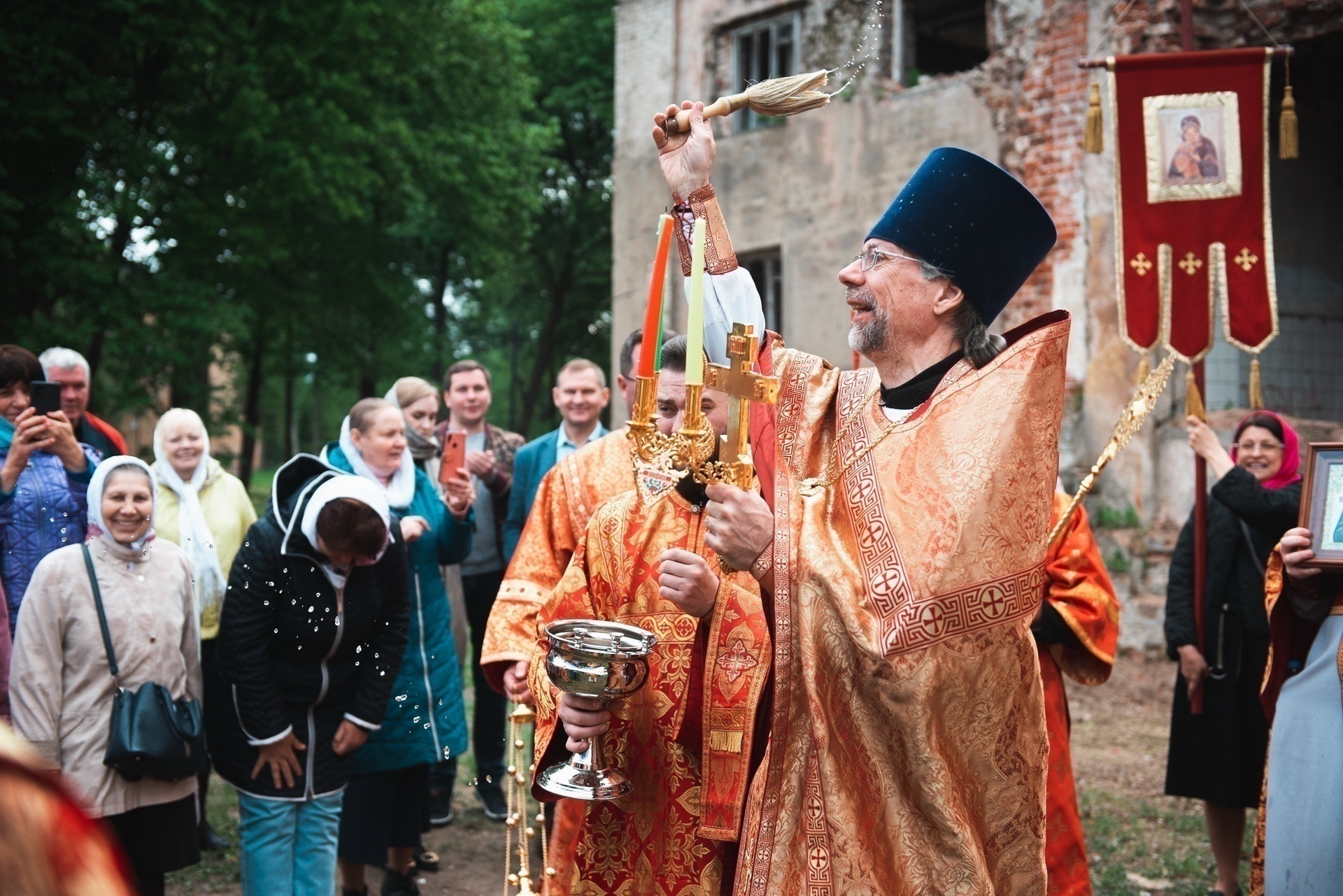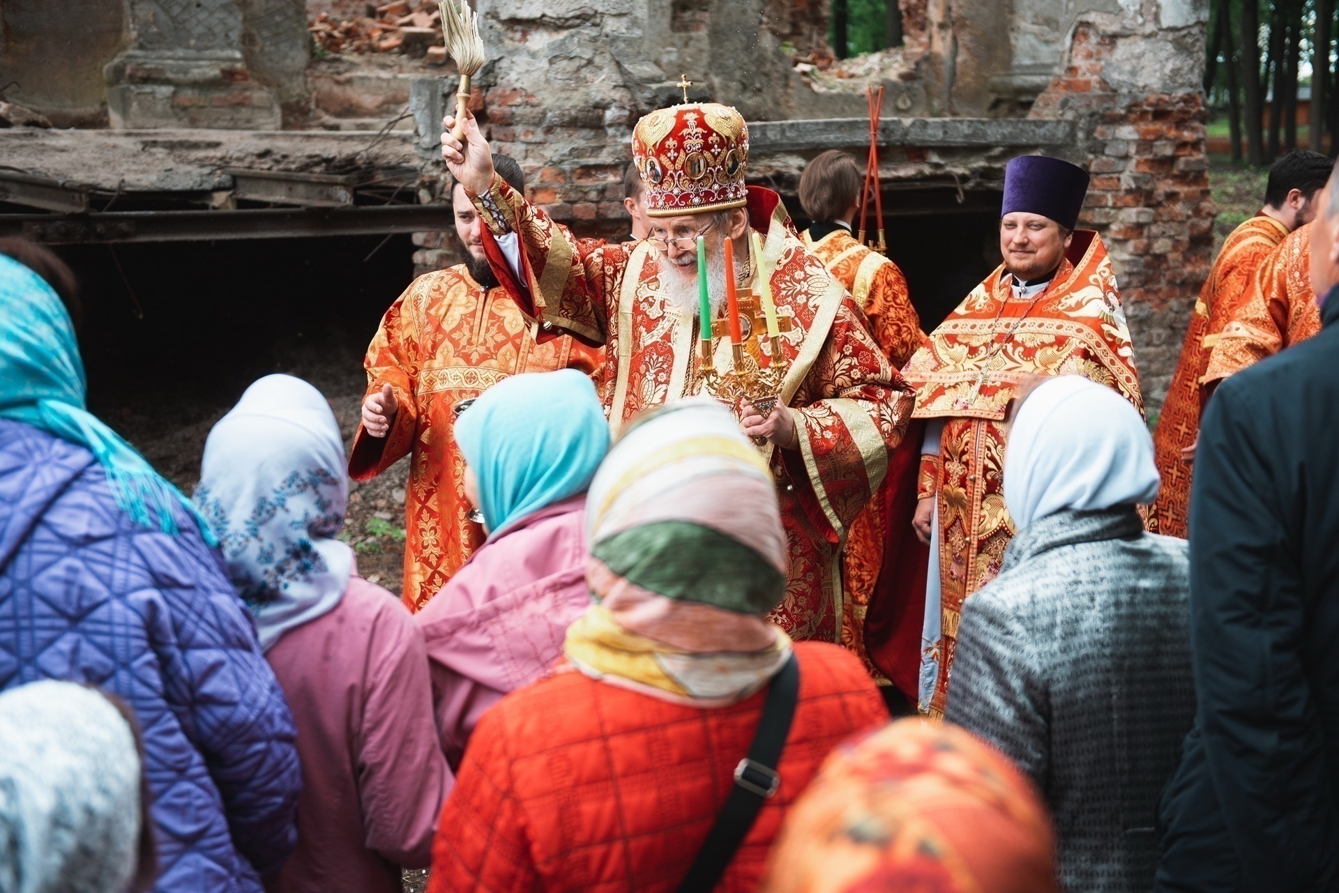 По окончании Литургии был совершён крестный ход вокруг порушенной святыни – каменного храма в честь апостола и евангелиста Иоанна Богослова, который находится на стадии восстановления.