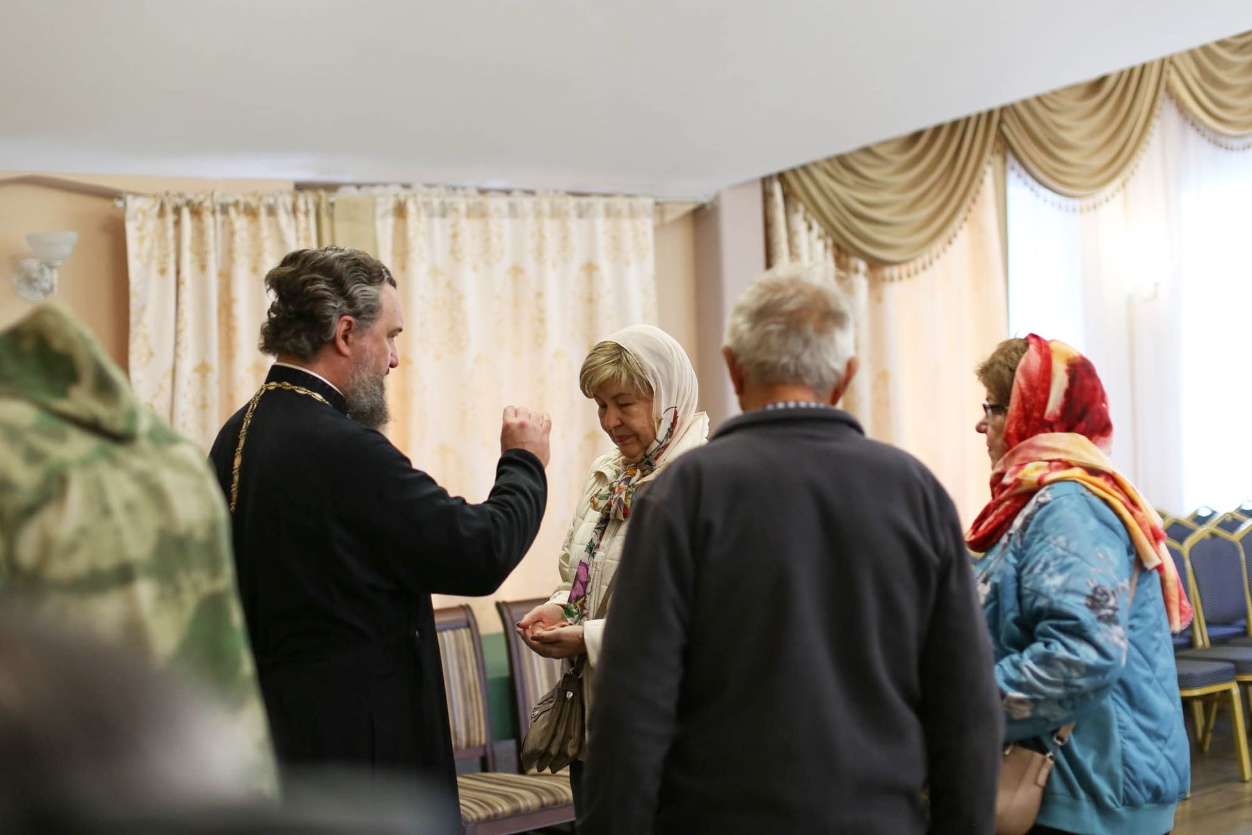 После посещения воскресного богослужения мобилизованный военнослужащий и его семья познакомились с отцом благочинным и его помощником священником Василием Алфеевым в зале просветительского центра Богоявленского собора.
