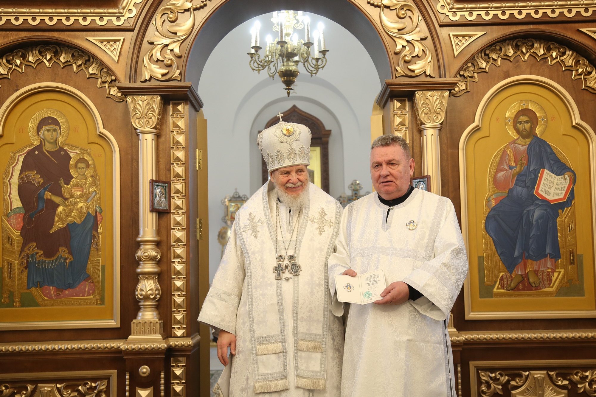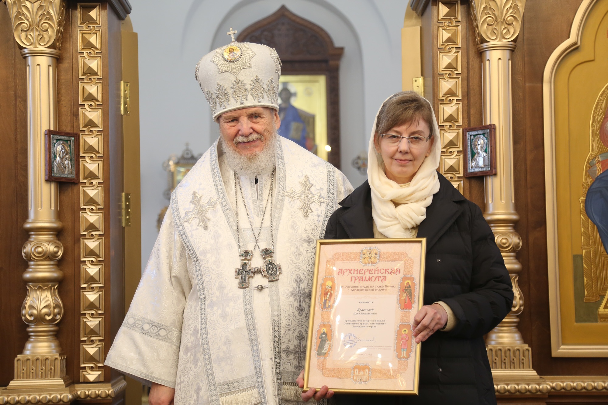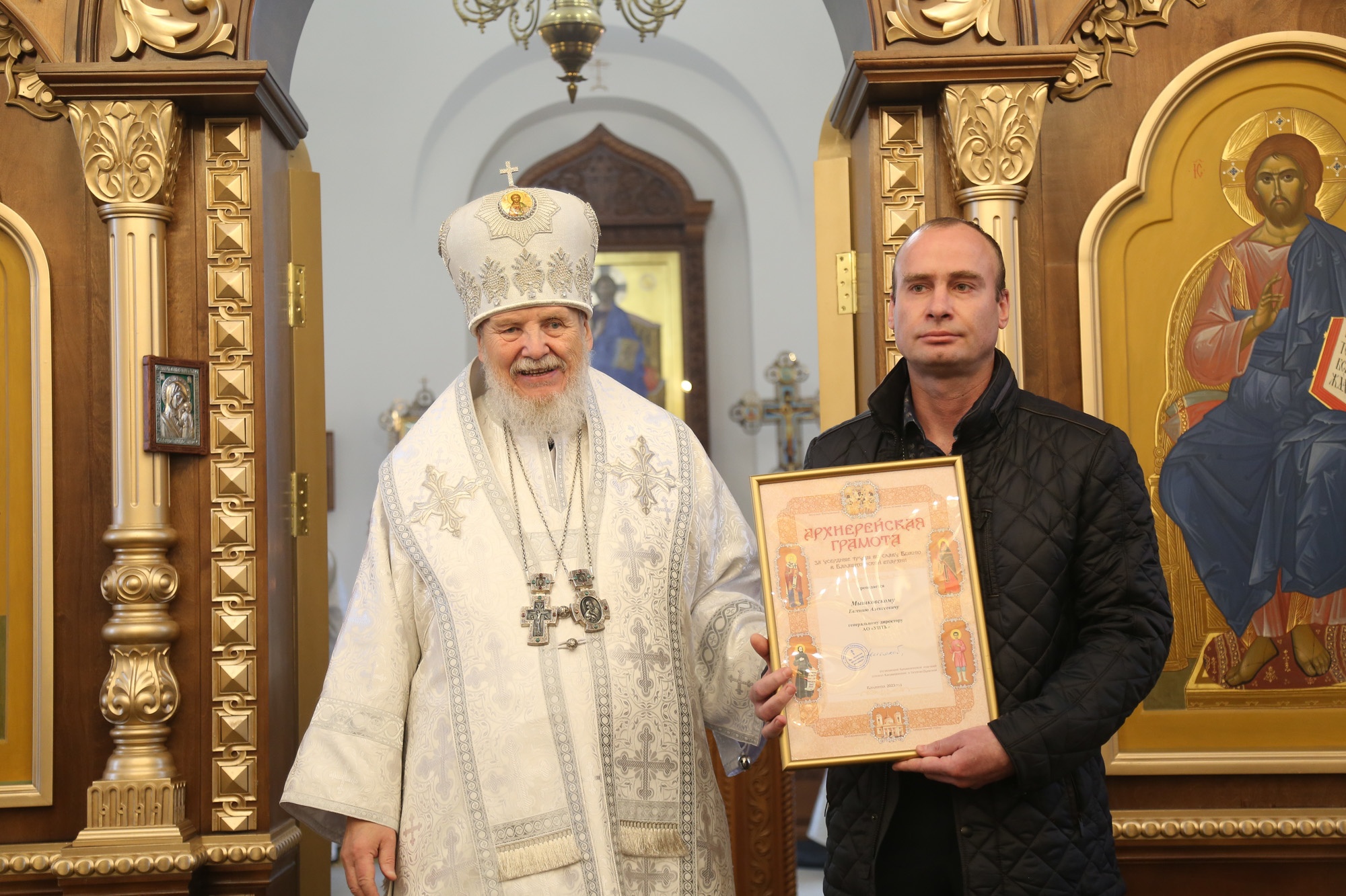 Затем Его Преосвященство обратился к сослужившему духовенству и молящимся с архипастырским словом, после чего вручил церковные награды духовенству и мирянам во внимание к трудам по восстановлению храма.