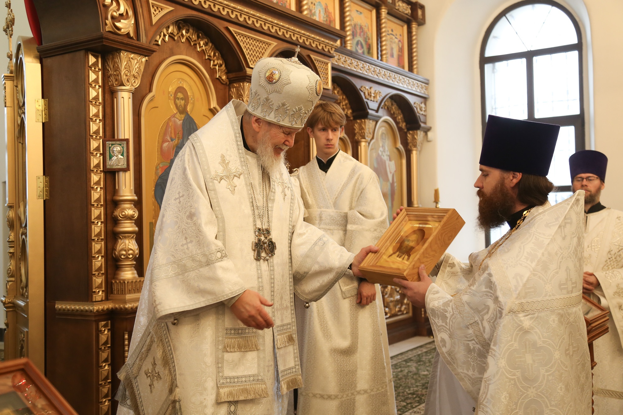 По окончании Литургии отец настоятель поблагодарил Владыку Николая за совершённое богослужение и преподнёс ему икону Спаса Нерукотворного.