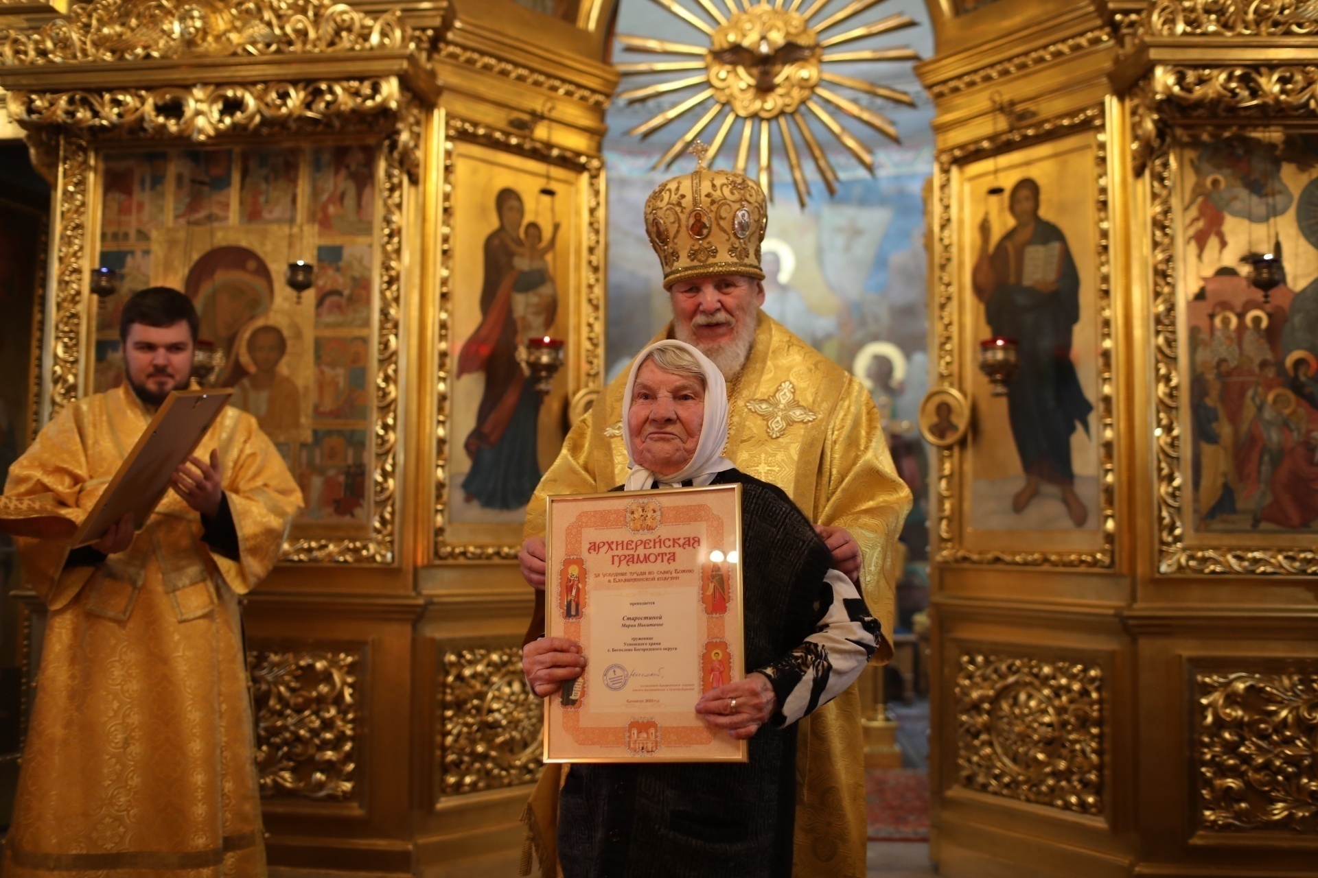 Затем Его Преосвященство обратился к сослужившему духовенству и молящимся с архипастырским словом и вручил приходским труженикам Архиерейские грамоты Балашихинской епархии.