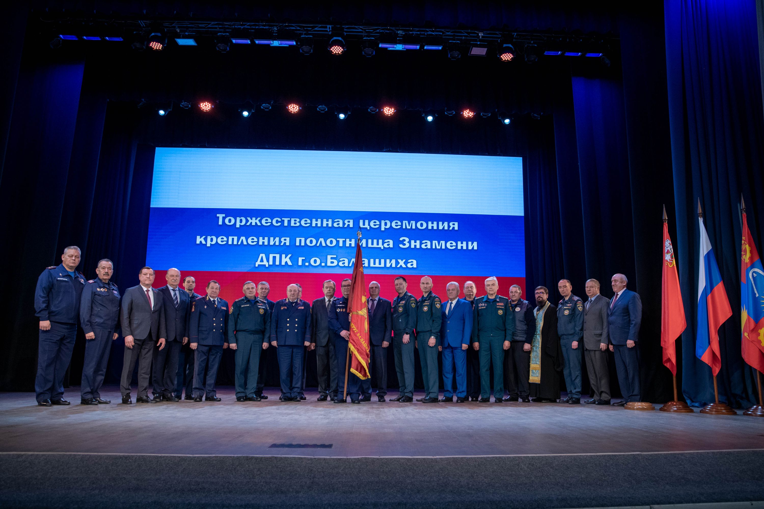 Почётные гости были приглашены на сцену для участия в церемонии крепления полотнища Знамени Добровольной пожарной команды городского округа Балашиха к древку, после чего священник Михаил Конюхов совершил чин освящения Знамени.