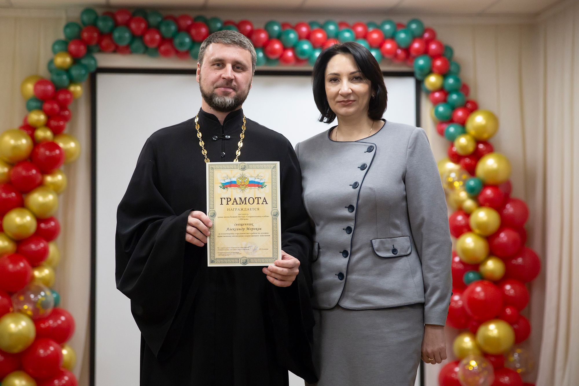 Заместитель благочинного Щёлковского церковного округа священник Димитрий Третьяков, исполняющий обязанности председателя комитета образования администрации городского округа Щёлково Елена Николаевна Бушнева и директор учебно-методического образовательного центра городского округа Щёлково Виктория Александровна Файрушина наградили священнослужителей благочиния, преподавателей и обучающихся муниципальных школ, принявших активное участие в мероприятиях в рамках Рождественских чтений, грамотами и памятными подарками.