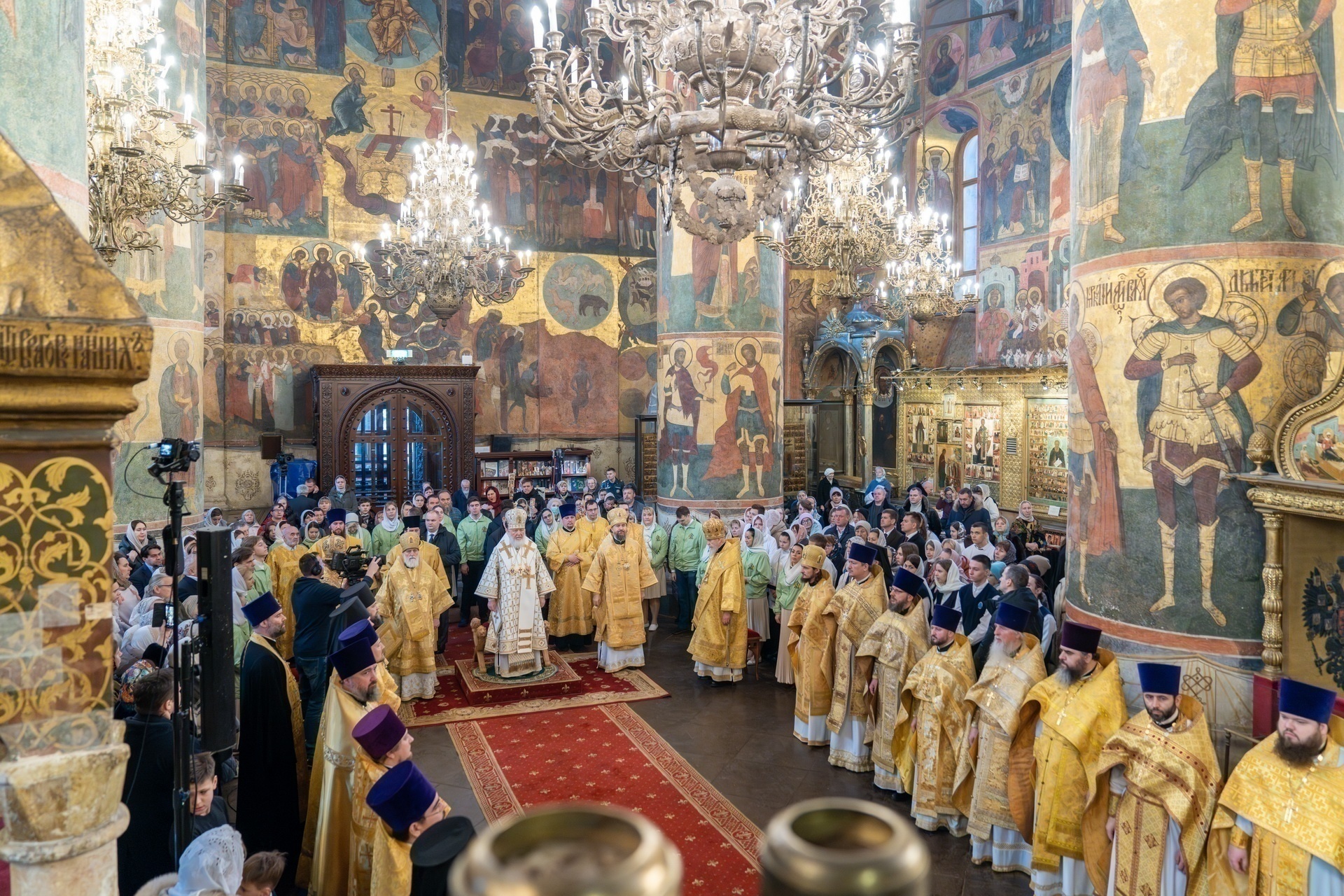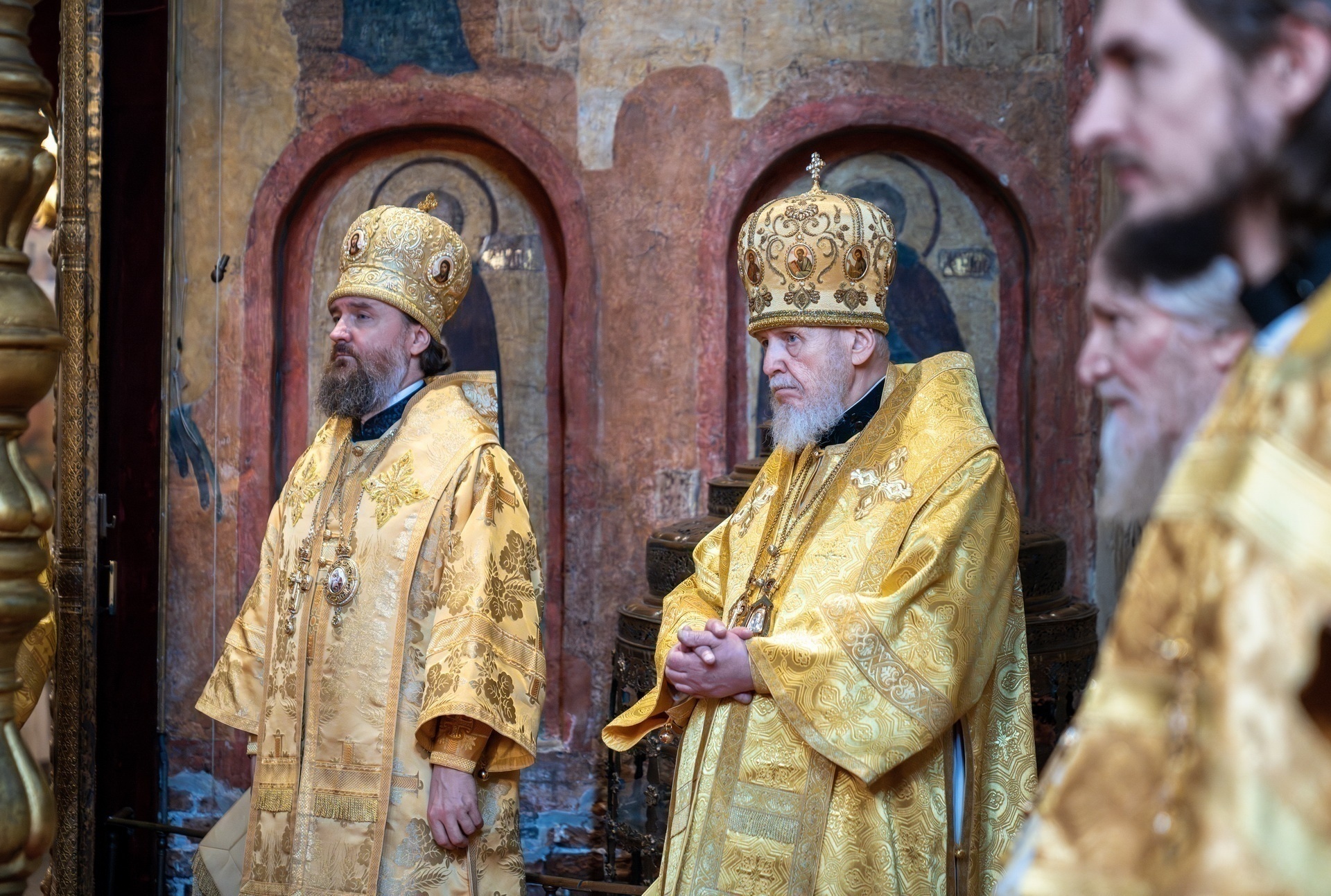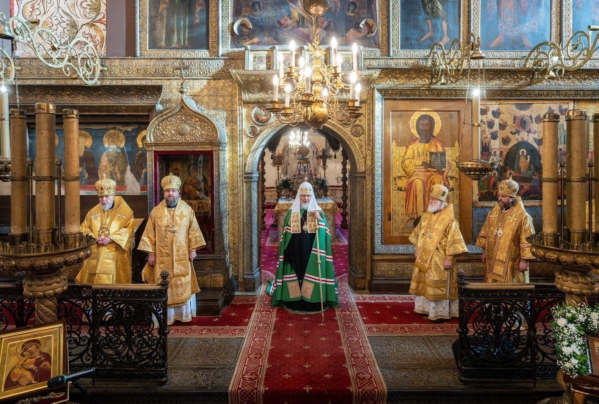 За Литургией Его Святейшеству сослужили: митрополит Крутицкий и Коломенский Павел, Патриарший наместник Московской митрополии; митрополит Воскресенский Григорий, управляющий делами Московской Патриархии, первый викарий Патриарха Московского и всея Руси по г. Москве; архиепископ Одинцовский и Красногорский Фома, руководитель Административного секретариата Московской Патриархии; епископ Балашихинский и Орехово-Зуевский Николай, руководитель и главный редактор Издательства Московской Патриархии; протопресвитер Владимир Диваков, секретарь Патриарха Московского и всея Руси по г. Москве; протоиерей Андрей Ковальчук, благочинный Щелковского округа Балашихинской епархии Московской митрополии, настоятель Троицкого собора г. Щелково Московской области; архимандрит Стефан (Диспиракис), представитель Патриарха Святого Града Иерусалима и всей Палестины при Патриархе Московском и всея Руси; архимандрит Алексий (Туриков), личный секретарь Святейшего Патриарха Кирилла; протоиерей Дионисий Казанцев, секретарь Святейшего Патриарха по Московской области; игумен Дионисий (Шленов), наместник Андреевского ставропигиального монастыря, руководитель аспирантуры Московской духовной академии; протоиерей Алексий Михаленя, секретарь Балашихинского епархиального управления, настоятель Богородице-Рождественского храма г. Балашихи Московской области; игумен Евмений (Лагутин), благочинный монастырей Балашихинской епархии, настоятель мужского монастыря Николо-Берлюковская пустынь; протоиерей Андрей Коробков, благочинный церквей Орехово-Зуевского округа Балашихинской епархии, настоятель Богородице-Рождественского собора г. Орехово-Зуево Московской области, межъепархиальный ответственный по вопросам семьи, защиты материнства и детства Московской митрополии; протоиерей Вячеслав Шестаков, настоятель храмов Патриаршего подворья в Зарядье г. Москвы, ризничий Патриаршего Успенского собора и храмов Московского Кремля; протоиерей Марк Ермолаев, благочинный Богородского округа Балашихинской епархии, настоятель Богоявленского собора г. Ногинска Московской области, председатель Межъепархиального отдела по взаимодействию с Вооруженными силами, правоохранительными органами и казачеством Московской митрополии; иерей Василий Лосев, руководитель Юридической службы Московской митрополии; иерей Павел Галушко, благочинный Лосино-Петровского округа Балашихинской епархии, настоятель Никольского храма г. Лосино-Петровский Московской области, руководитель пресс-службы Московской митрополии; клирики Балашихинской и других епархий Московской митрополии, а также города Москвы.