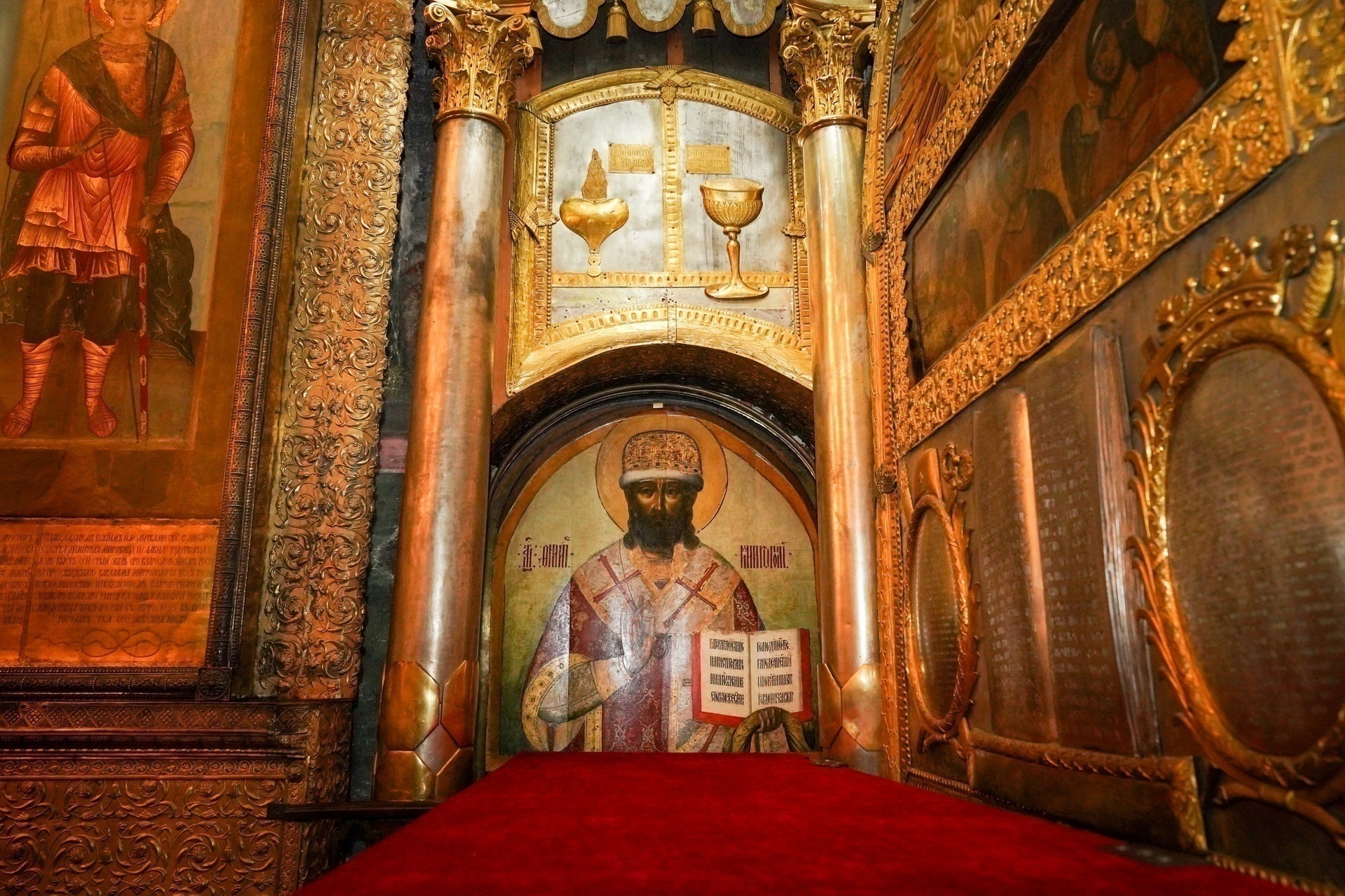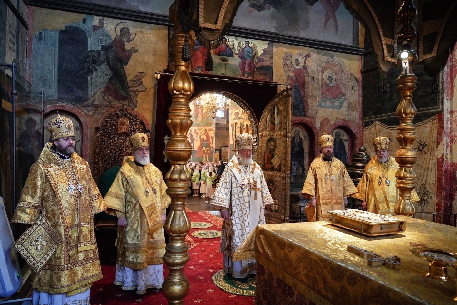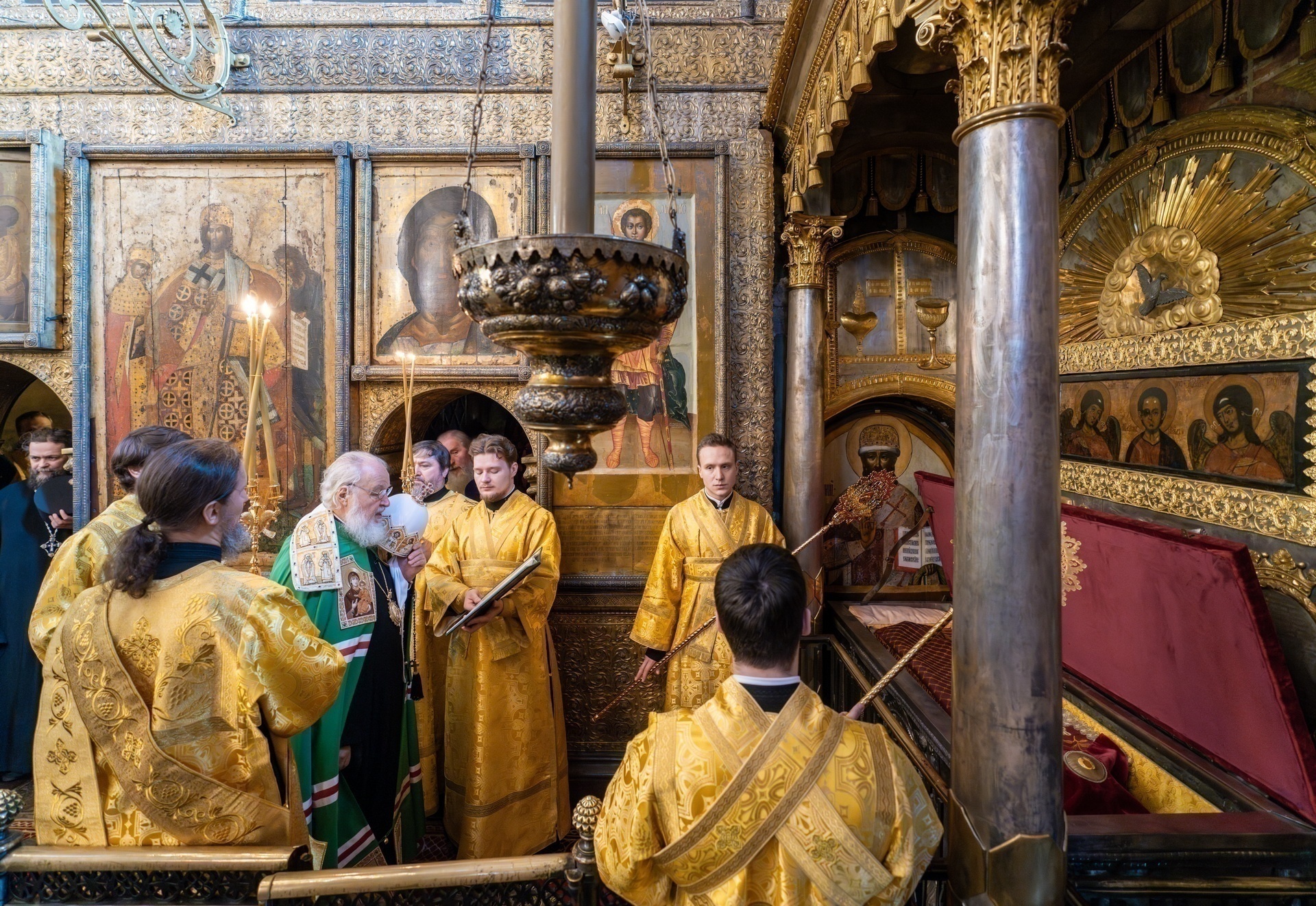 По прибытии в собор Предстоятель Русской Православной Церкви поклонился честным мощам святителя Филиппа, почивающим в раке на правой стороне солеи.