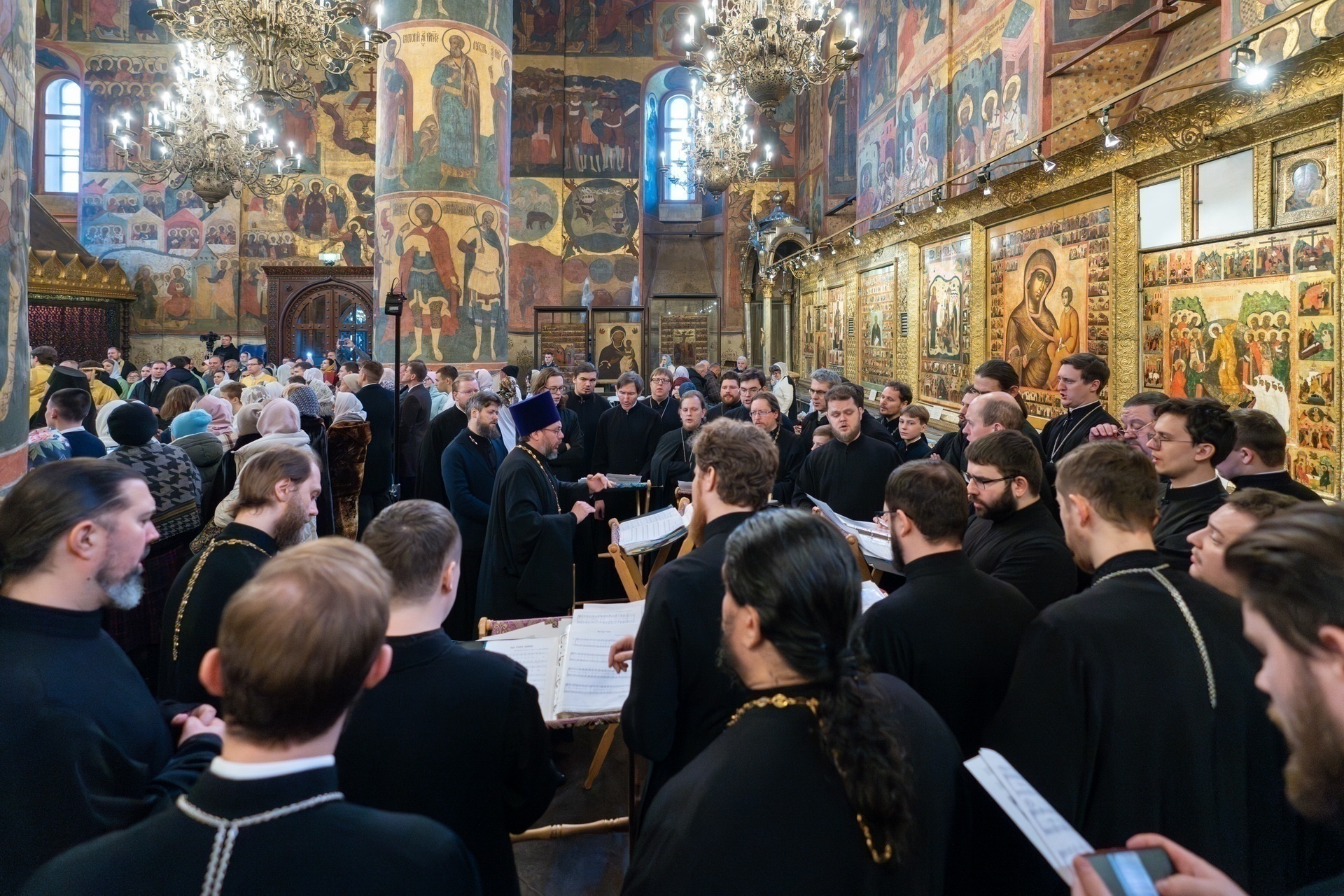 Богослужебные песнопения исполнили хор духовенства Московской митрополии и ансамбль солистов хора духовенства Екатеринбургской митрополии под управлением священника Сергия Голева.