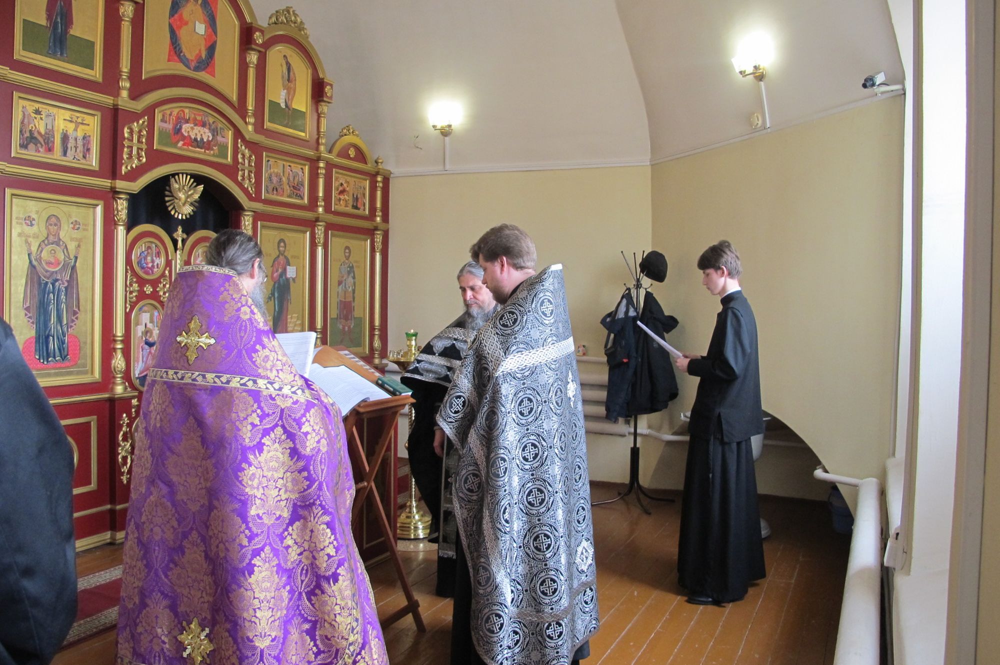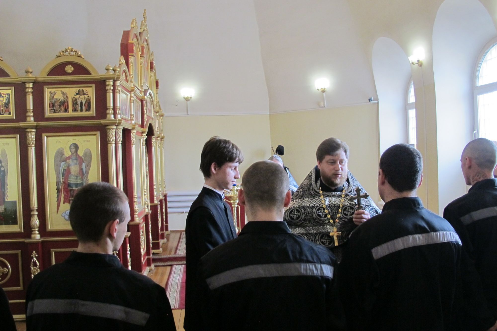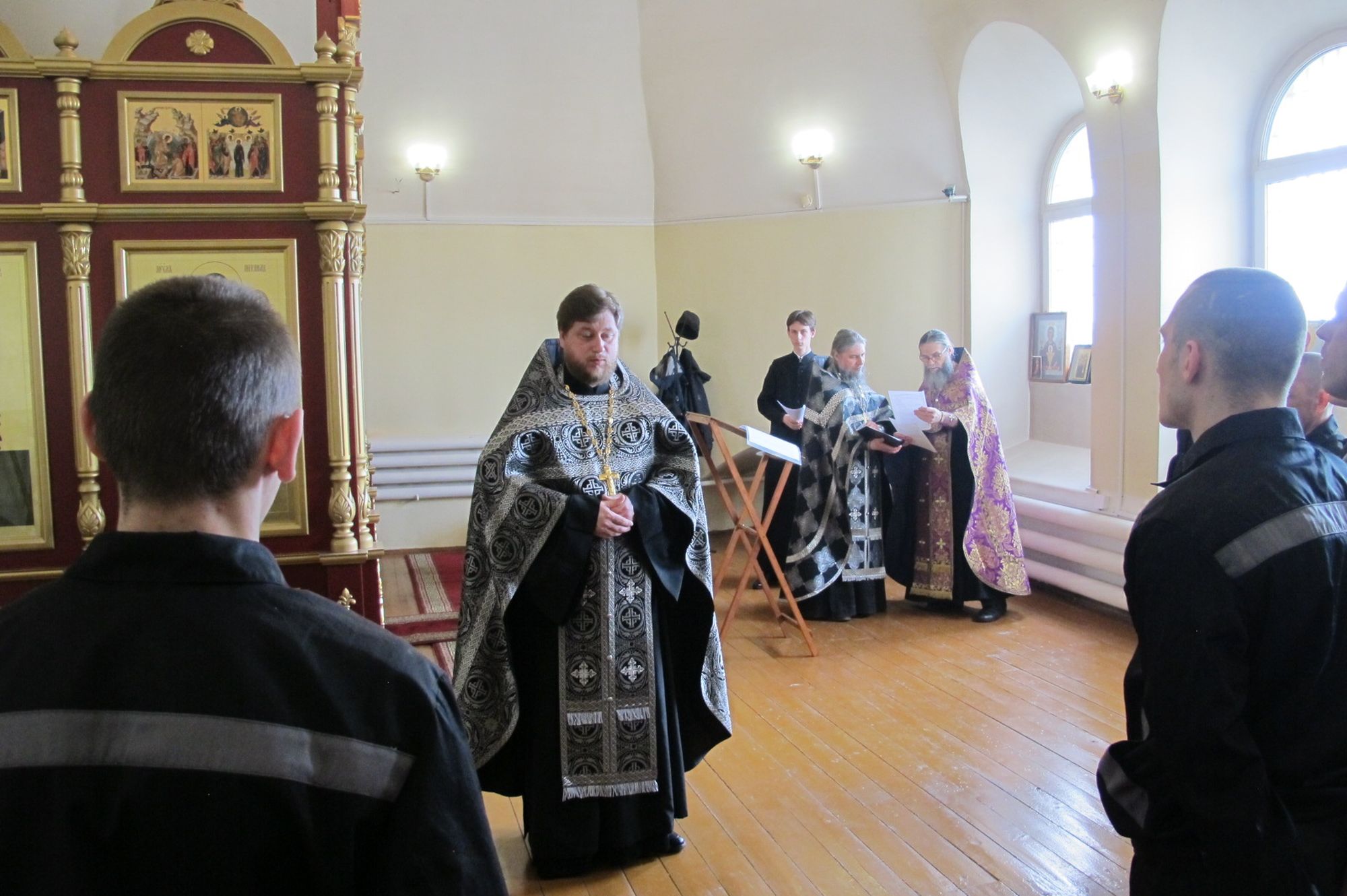 В сослужении председателя Отдела по тюремному служению Подольской епархии священника Валерия Гололобова и настоятеля Воскресенского храма г. Серпухова протоиерея Алексия Филатова отец Михаил совершил молебное пение «О всех во узах темничных пребывающих».