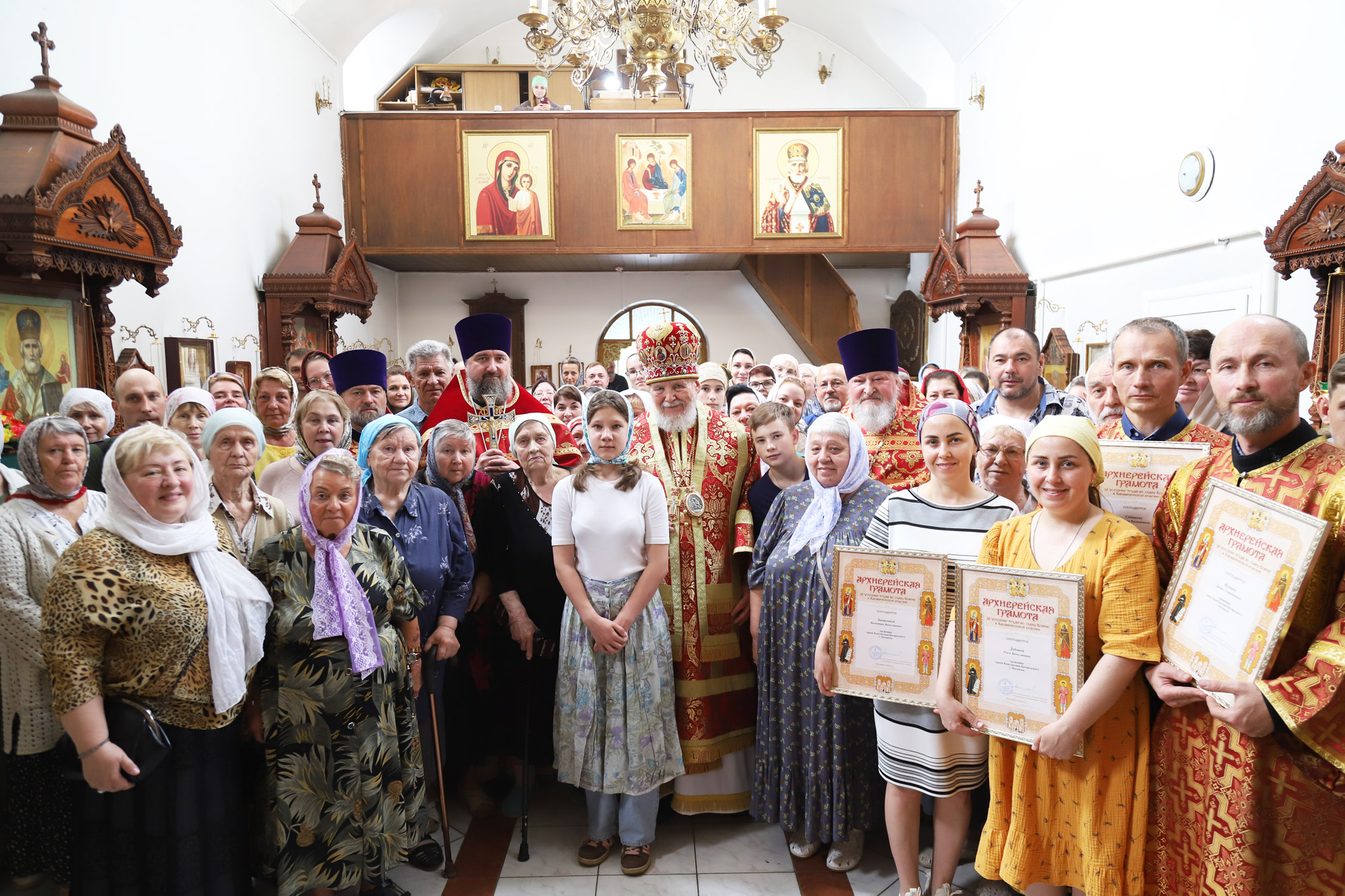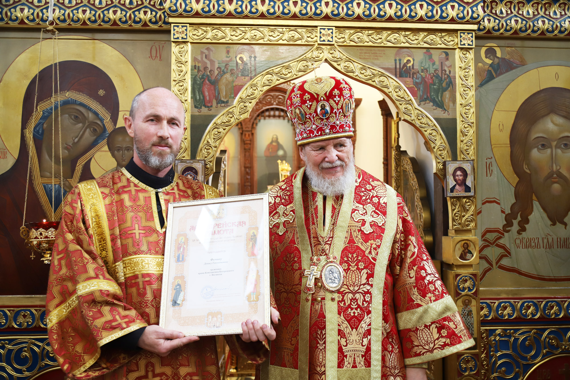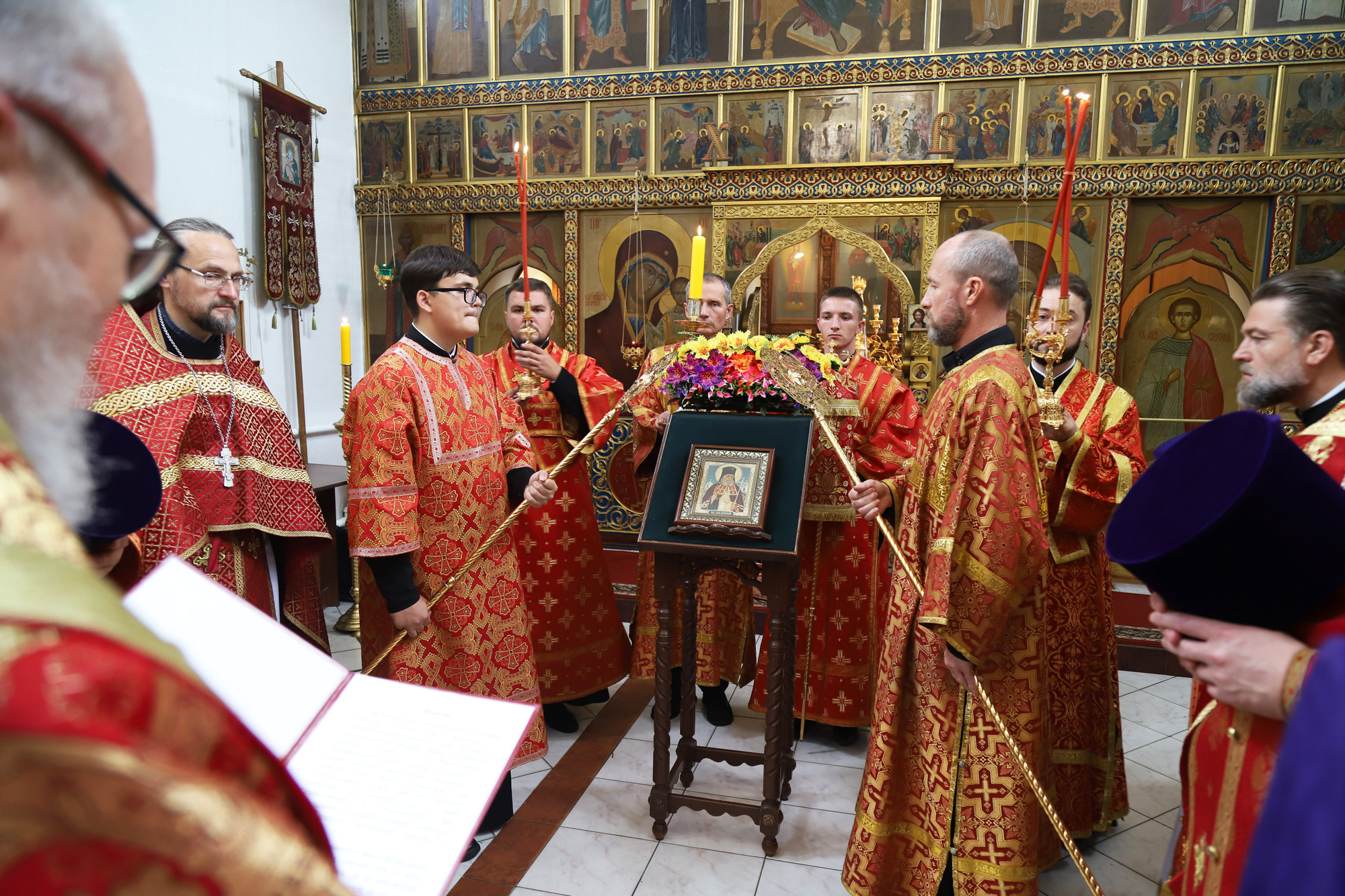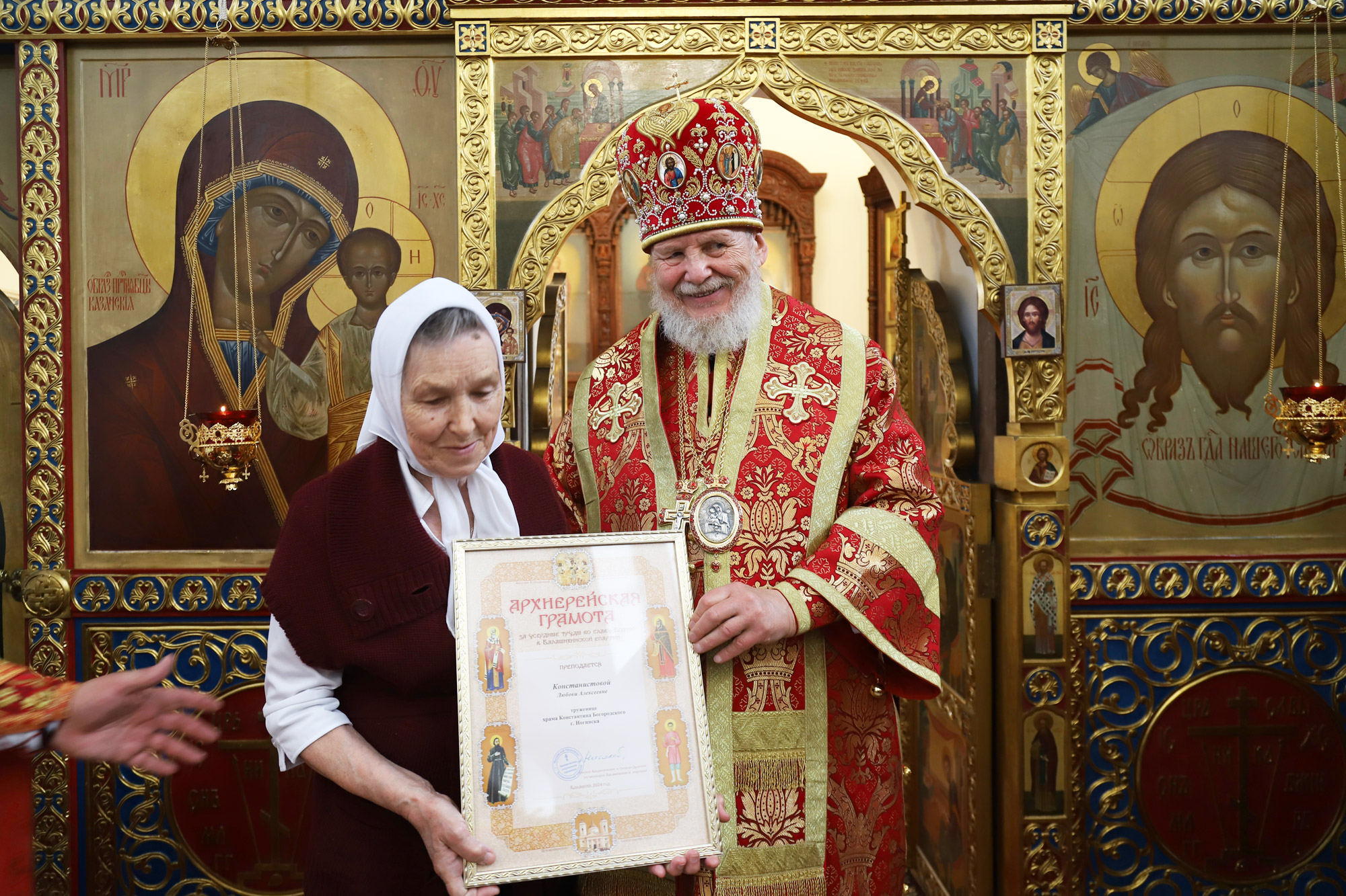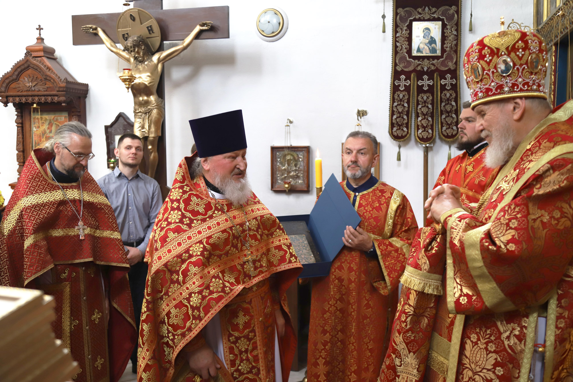 По окончании Литургии было совершено славление перед иконой святителя Луки (Войно-Ясенецкого), исповедника, архиепископа Симферопольского и Крымского, после чего отец настоятель поблагодарил Его Преосвященство за совершённое богослужение и преподнёс ему в дар старинные книги.