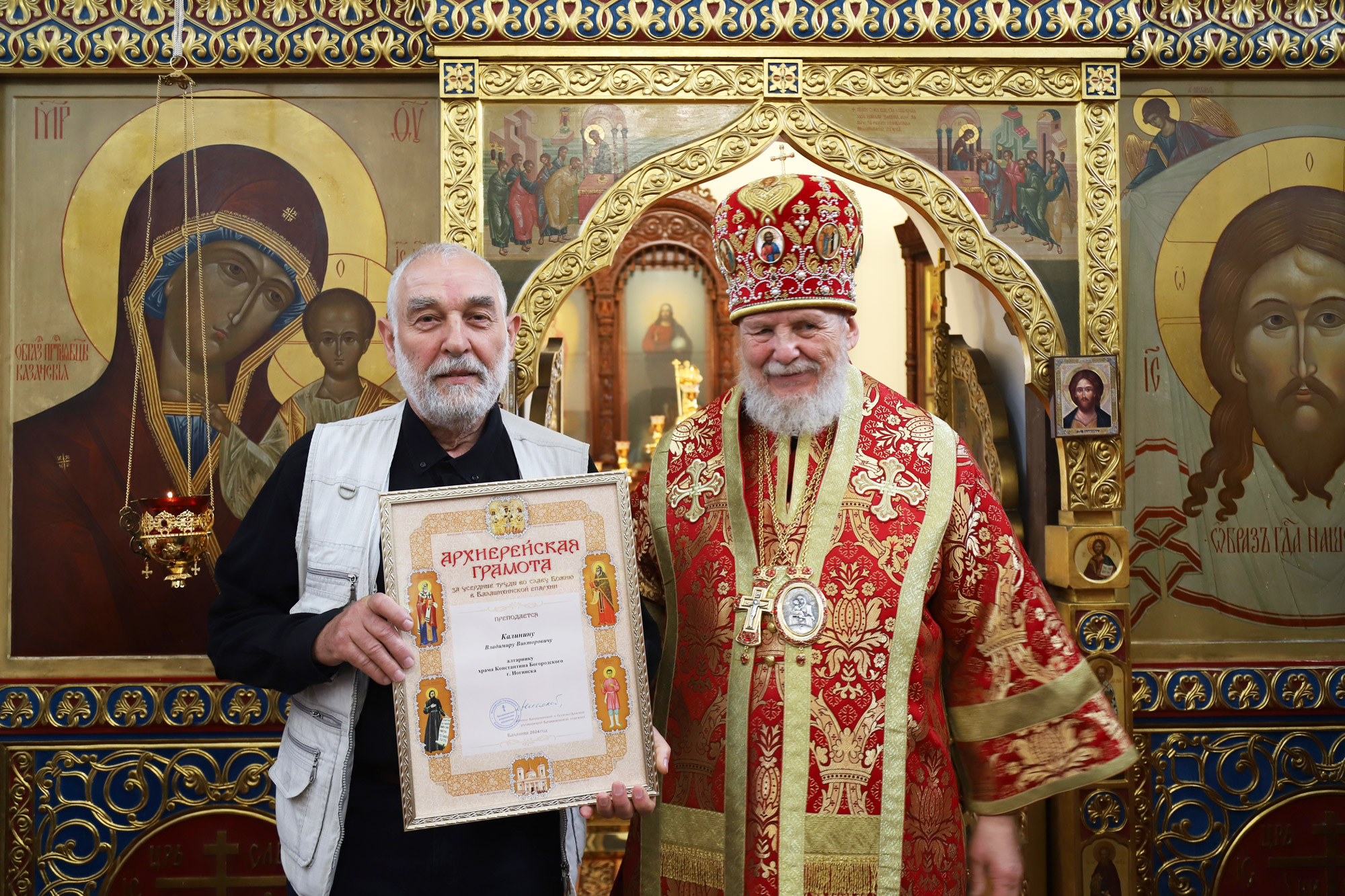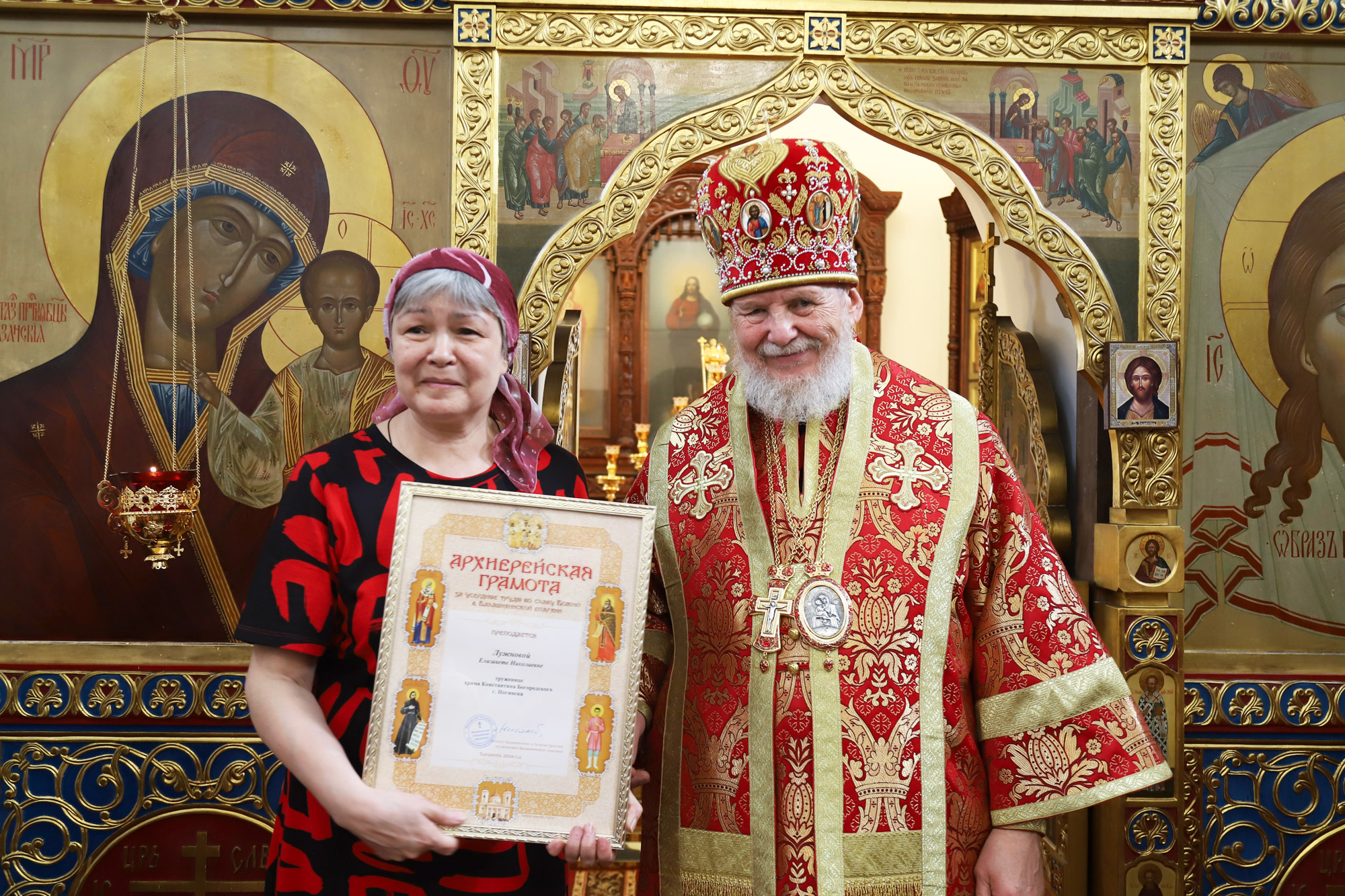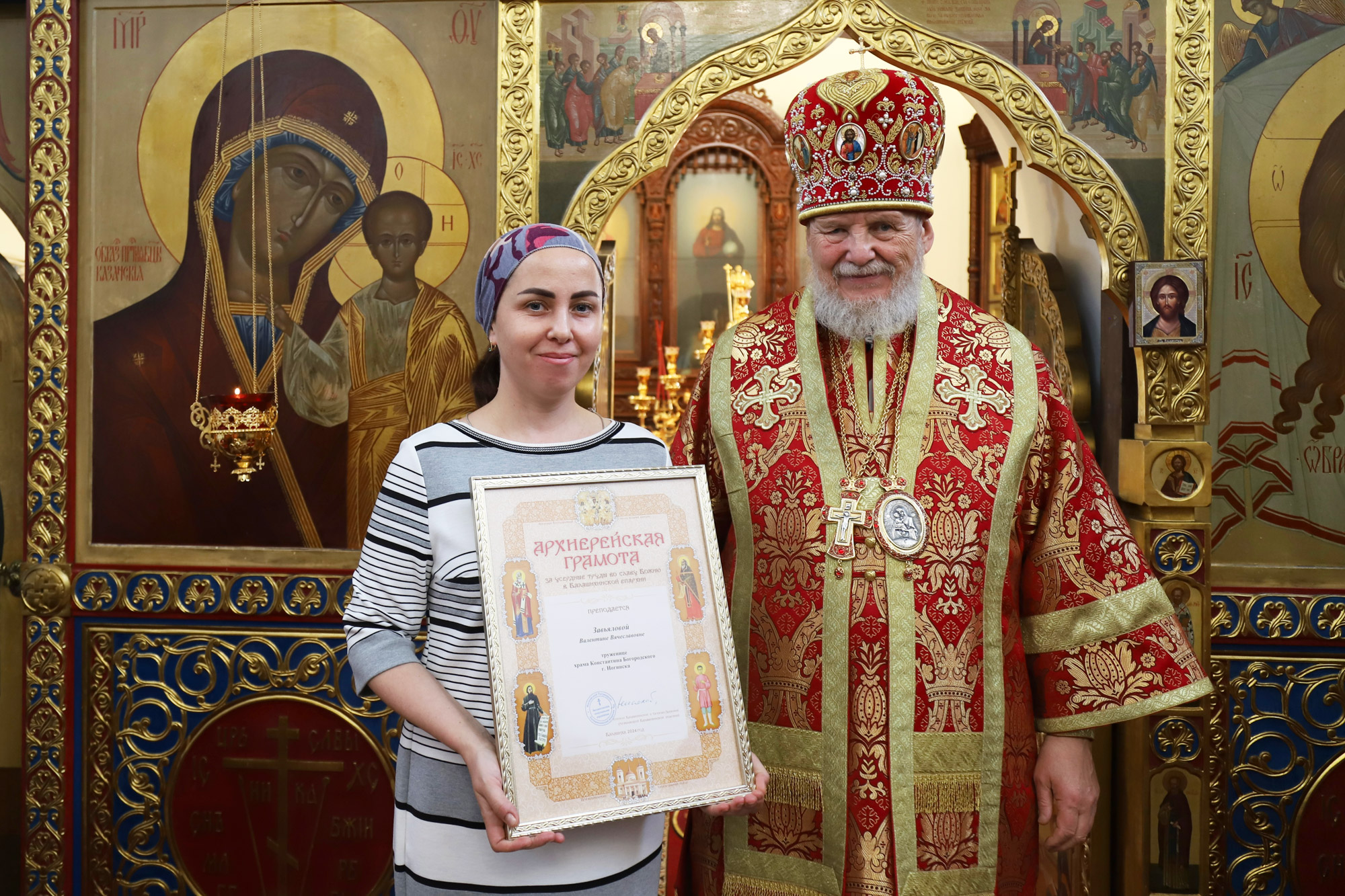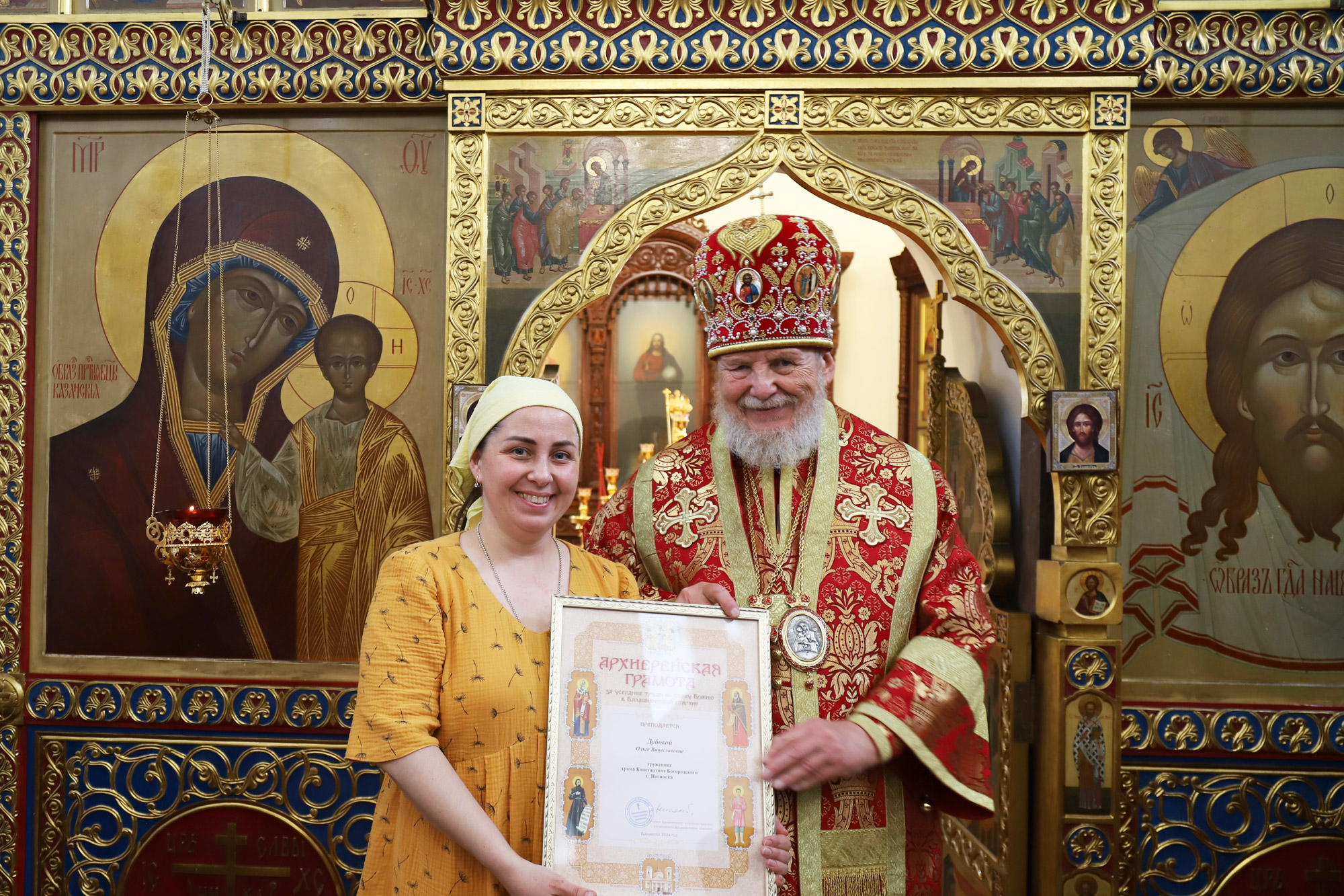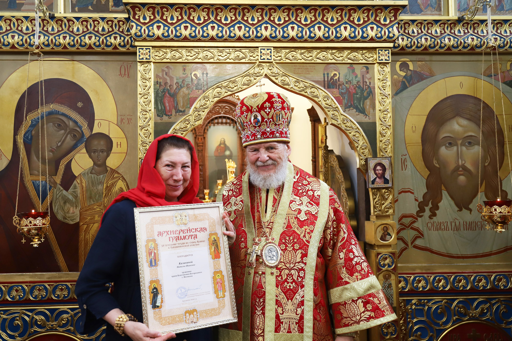 По окончании Литургии было совершено славление перед иконой святителя Луки (Войно-Ясенецкого), исповедника, архиепископа Симферопольского и Крымского, после чего отец настоятель поблагодарил Его Преосвященство за совершённое богослужение и преподнёс ему в дар старинные книги.