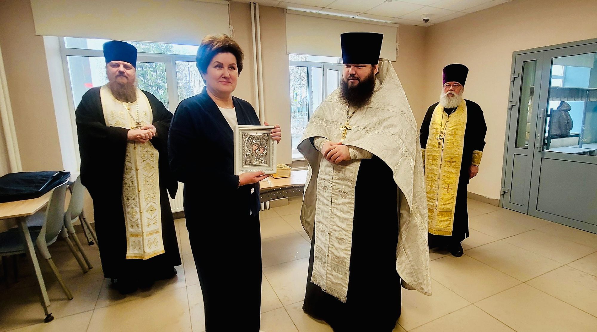 По окончании богослужения отец Александр обратился к коллективу учреждения с пастырским словом и передал директору Е. А. Прониной в благословение Казанскую икону Божией Матери.