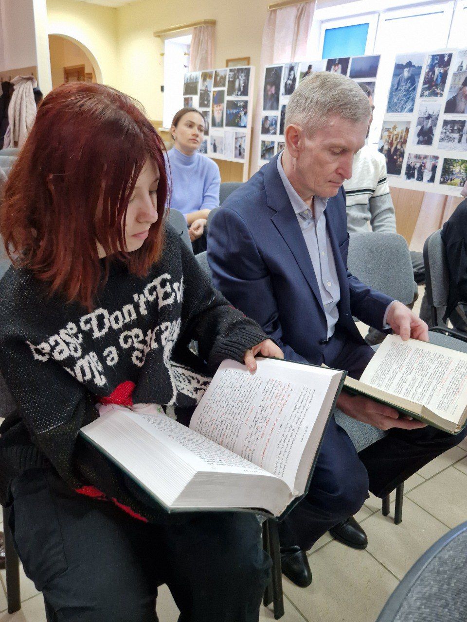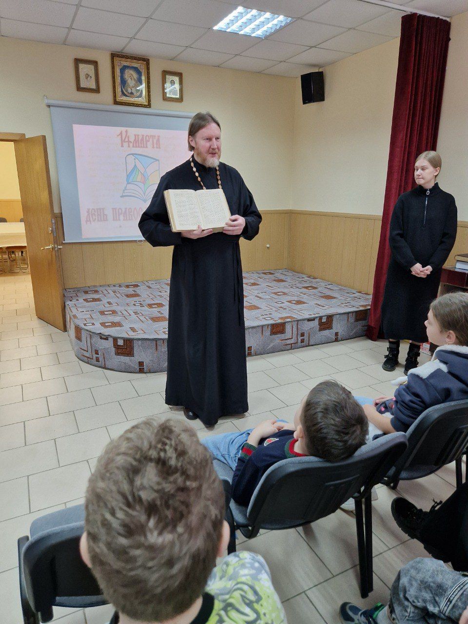 Библиотекарь, прихожанка Успенского храма Н. В. Родникова провела для гостей час истории, посвящённый Дню православной книги. Дети узнали о первой на Руси типографии, о первопечатнике Иване Фёдорове, о первой датированной печатной книге «Апостол», ознакомились с книжным фондом библиотеки, с литературой об известных русских святых - преподобном Сергии Радонежском, блаженном Василии Московском чудотворце и посмотрели видео-презентацию об их жизни.