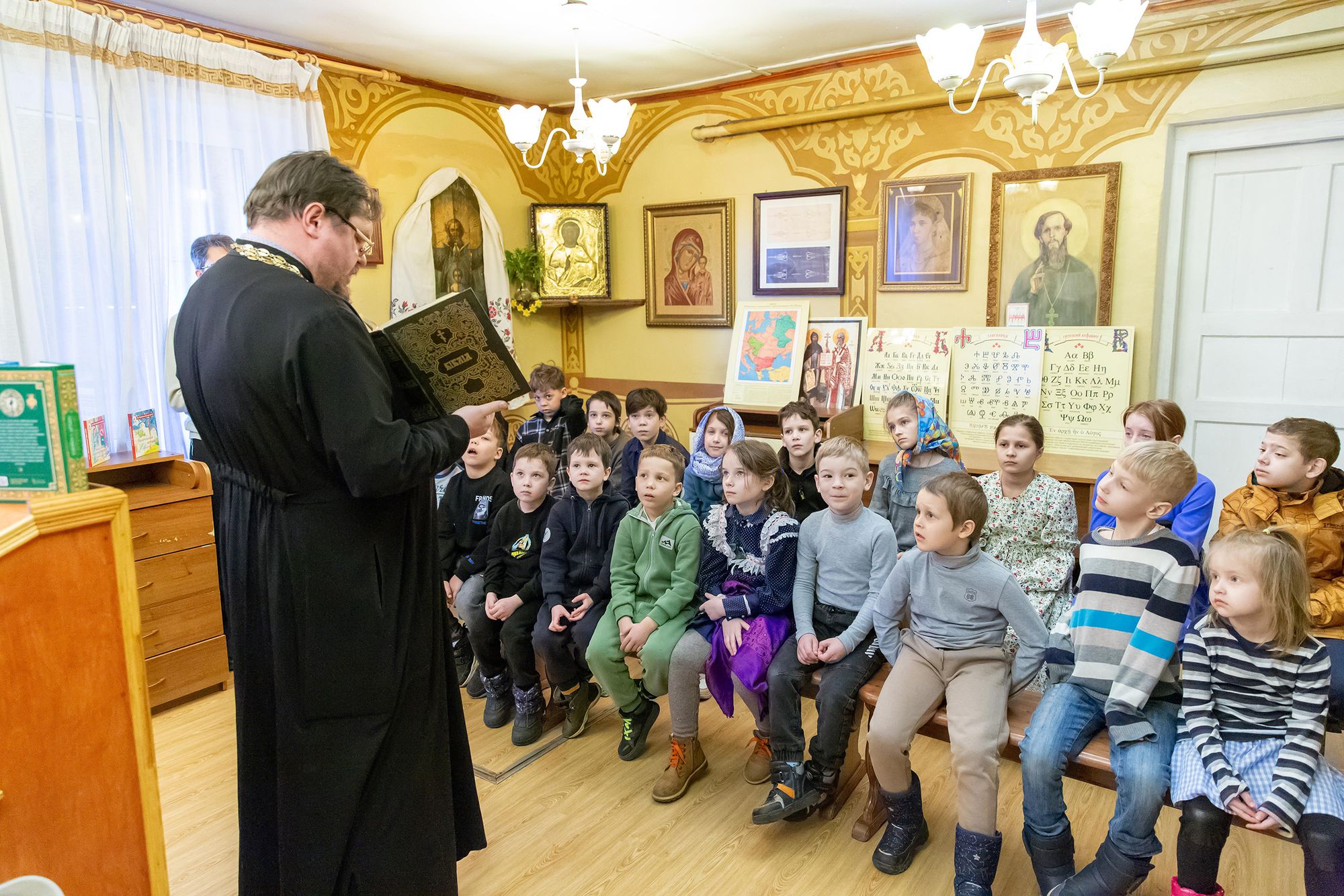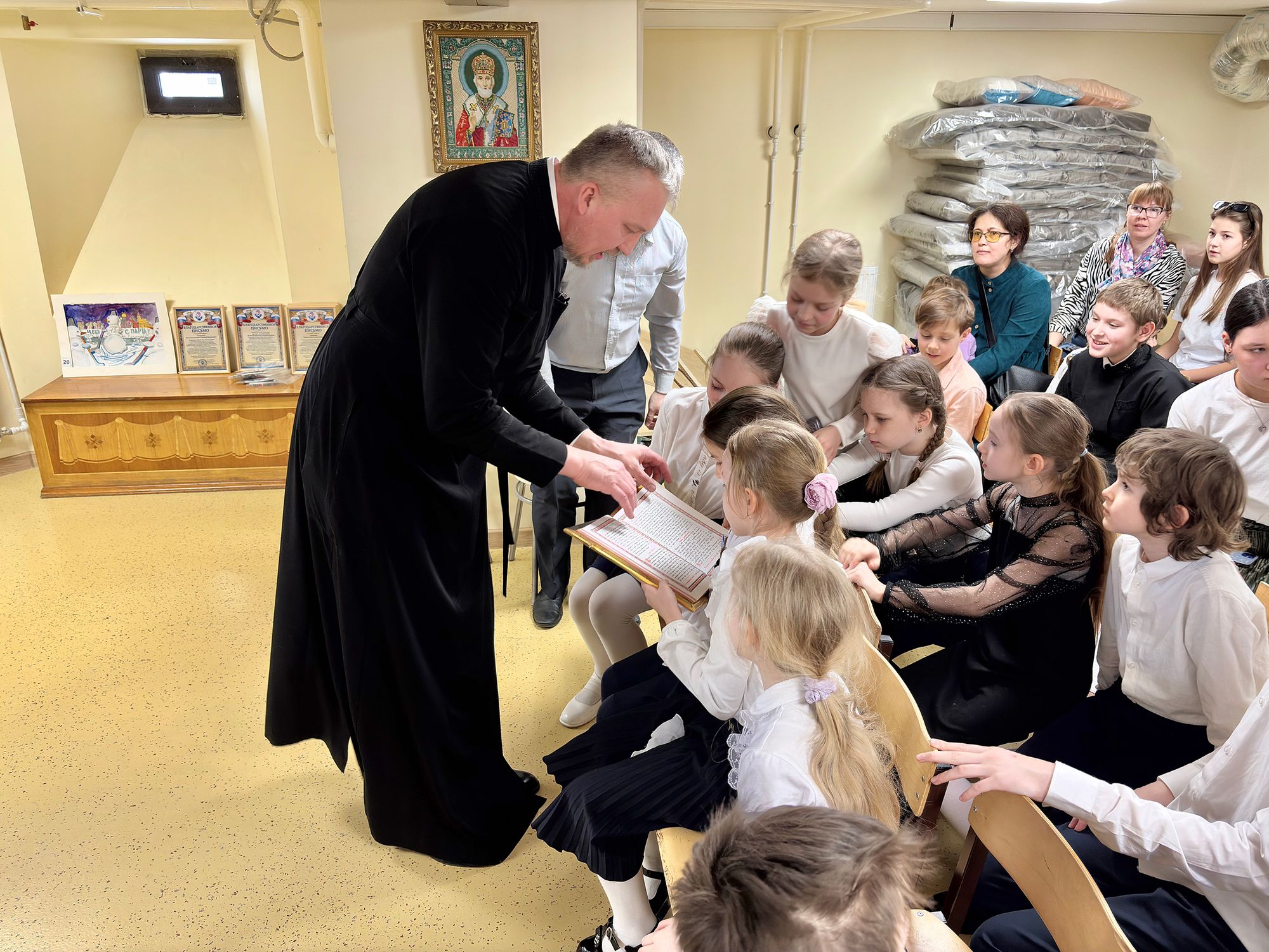 23 марта в воскресной школе при храме блаженной Ксении Петербургской деревни Медвежьи Озёра благочинный Щёлковского церковного округа протоиерей Андрей Ковальчук поблагодарил руководителей, сотрудников и воспитанников учреждения за активную гражданскую позицию по оказанию помощи бойцам, находящимся в зоне проведения Специальной военной операции, вручил Благодарственные письма от волонтёрской организации «Неравнодушное Подмосковье» и открыл празднование Дня православной книги.