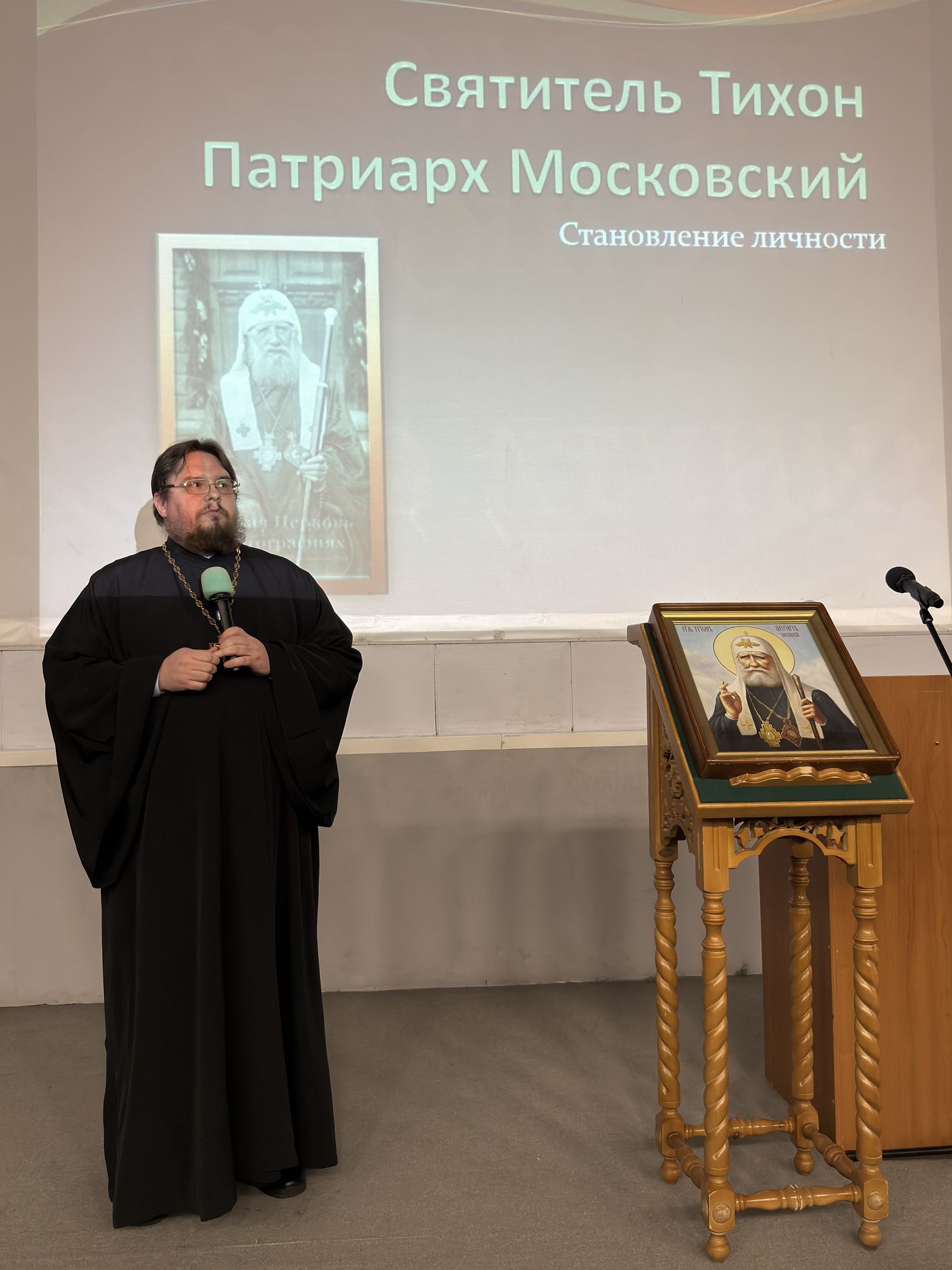 Клирик Державного храма города Фрязино протоиерей Александр Бутрин рассказал о содержании проповедей и посланий святителя Тихона в 1917-1925 гг., а также представил свою книгу «Ангел Русской Церкви», посвященную Патриарху Тихону и выпущенную Державным храмом города Фрязино в 2025 г.