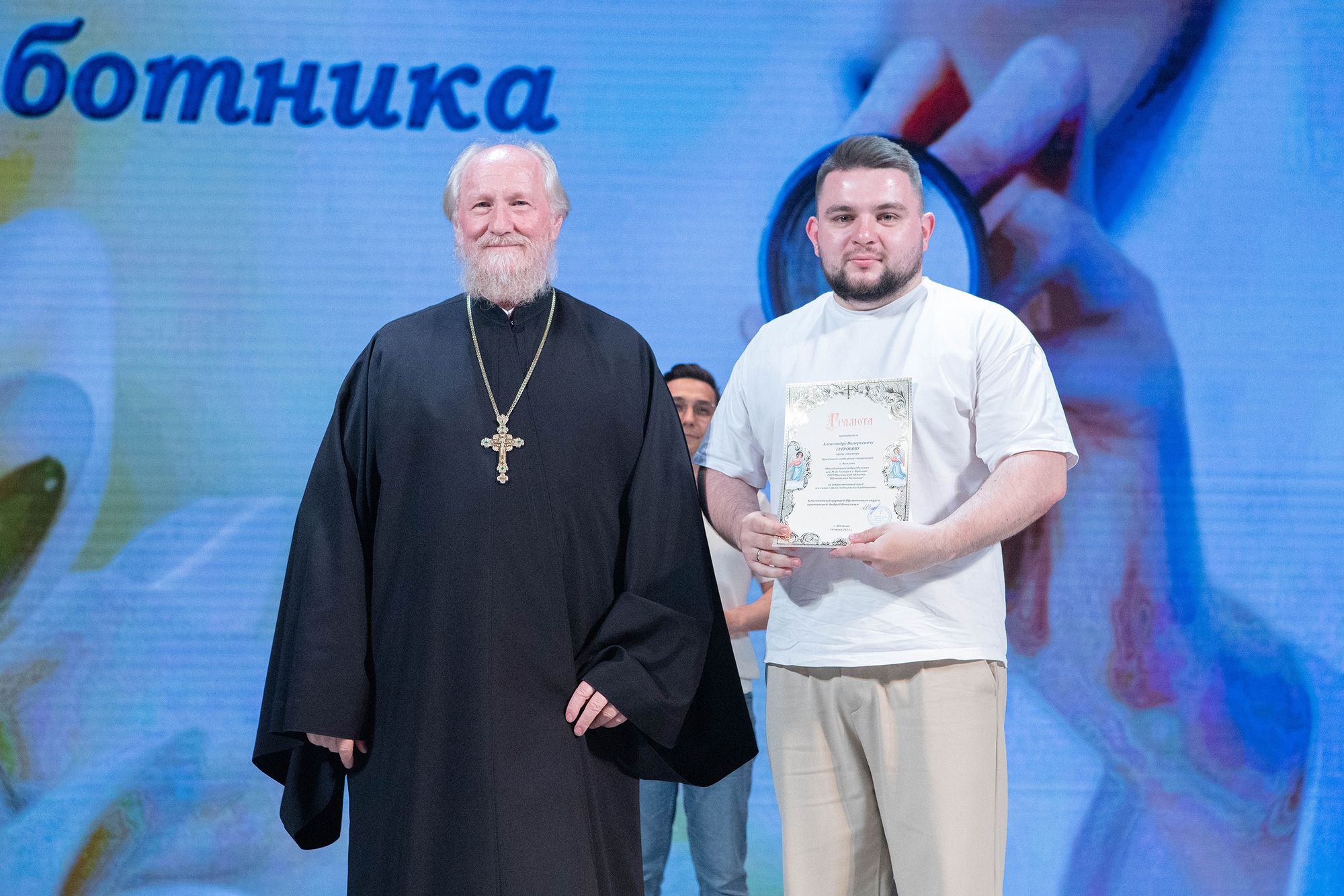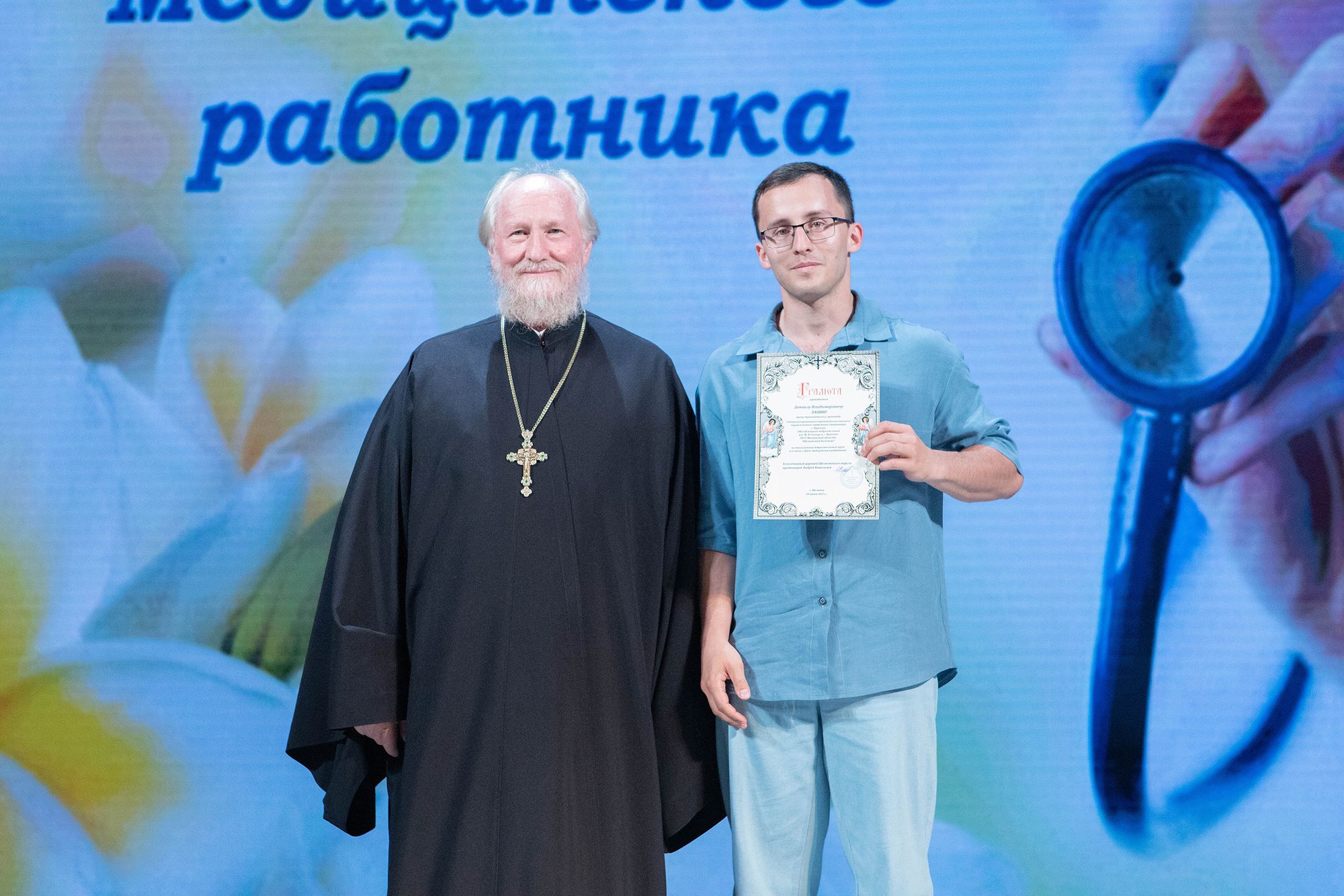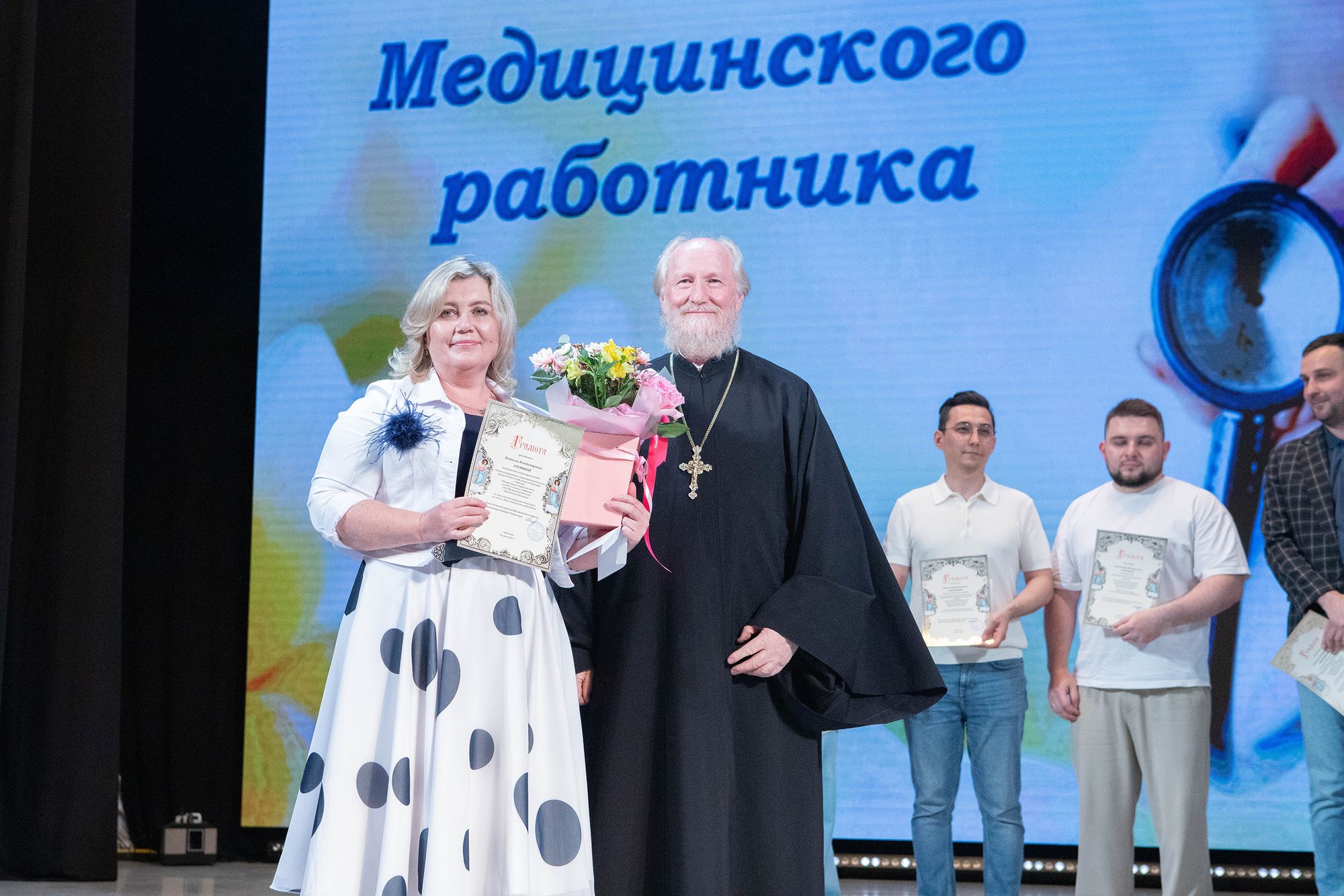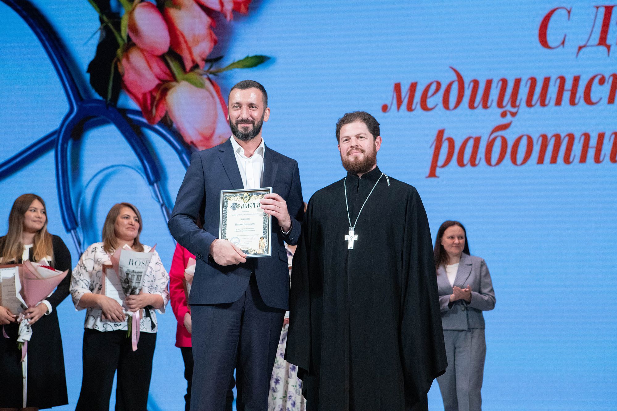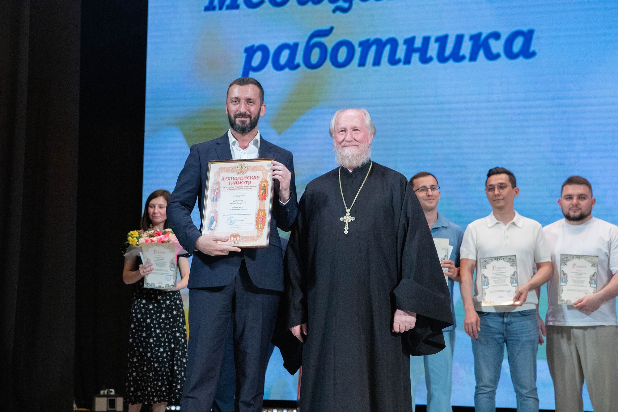Отец Андрей вручил архиерейские грамоты Балашихинской епархии и грамоты Щёлковского благочиния главному врачу Щёлковской областной больницы Николаю Красикову и медицинским работникам городских округов Щёлково и Фрязино.