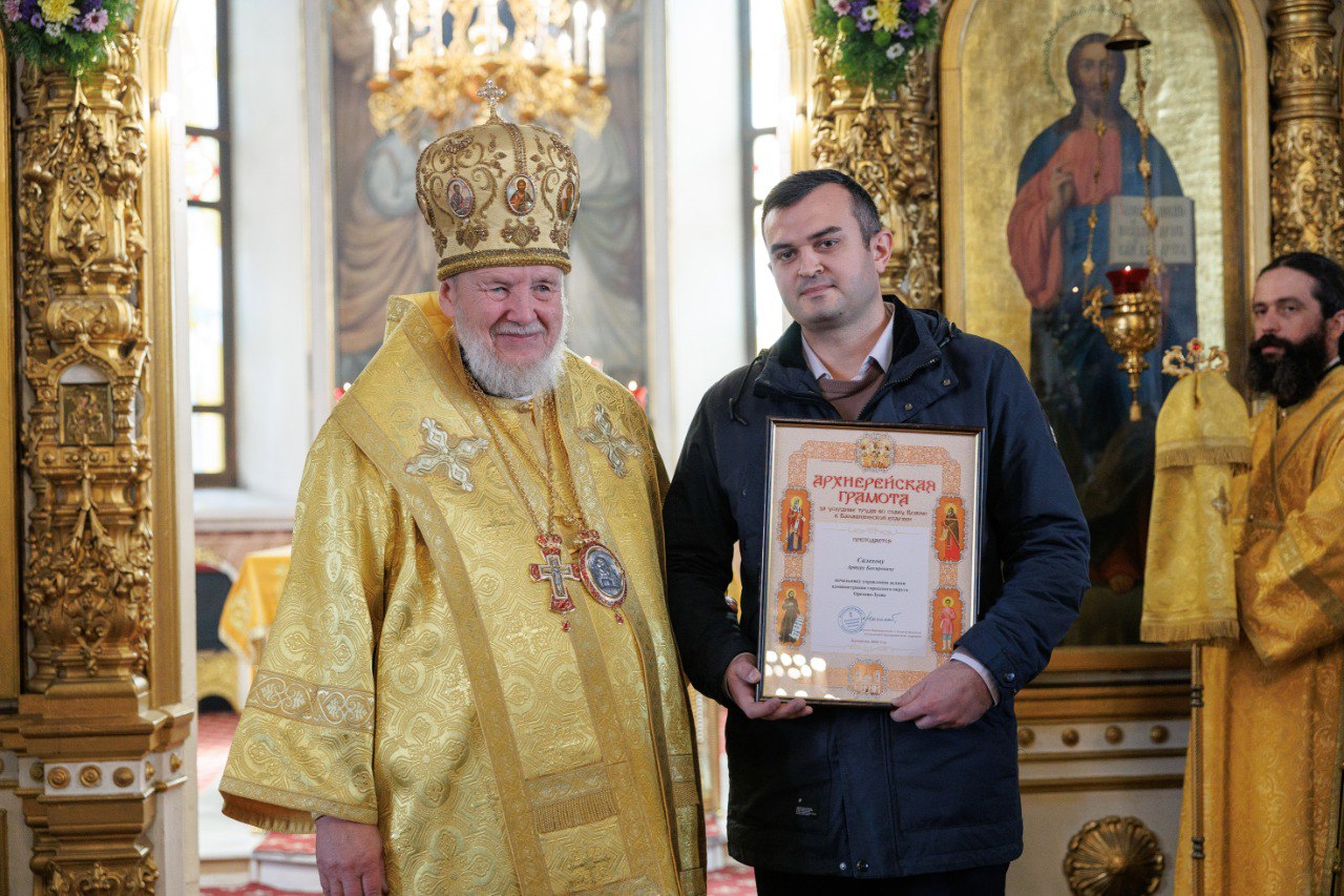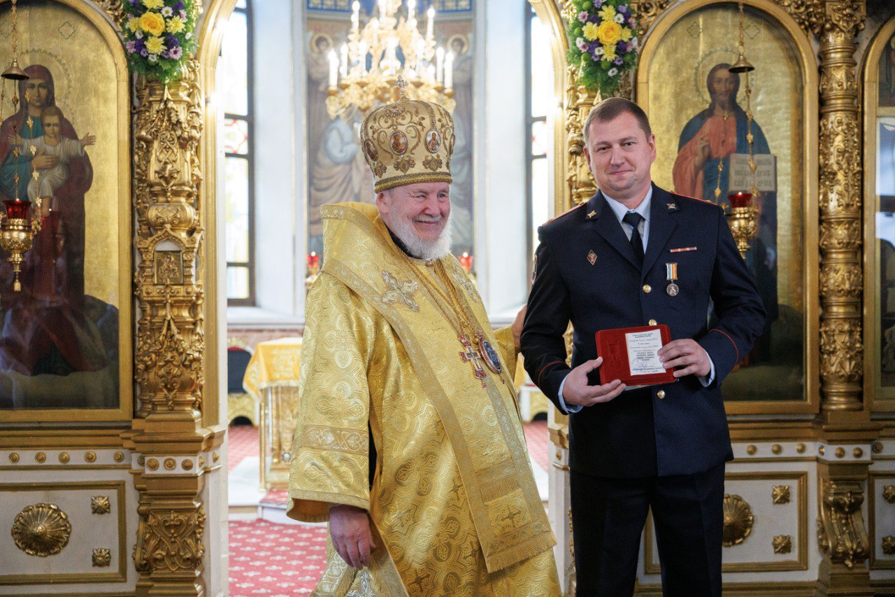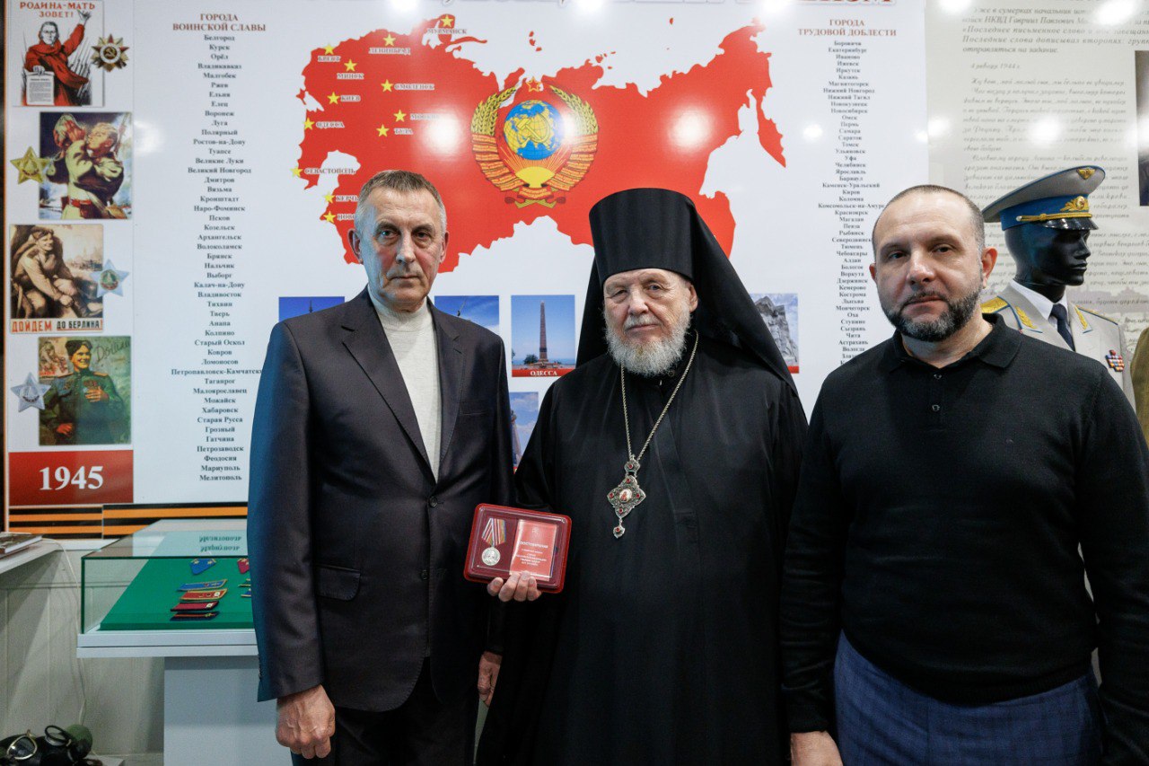 Глава городского округа Р. В. Заголовацкий наградил епископа Николая памятной медалью Героя России гвардии майора Алексея Осокина за многолетнюю работу по окормлению военнослужащих - участников Специальной военной операции.