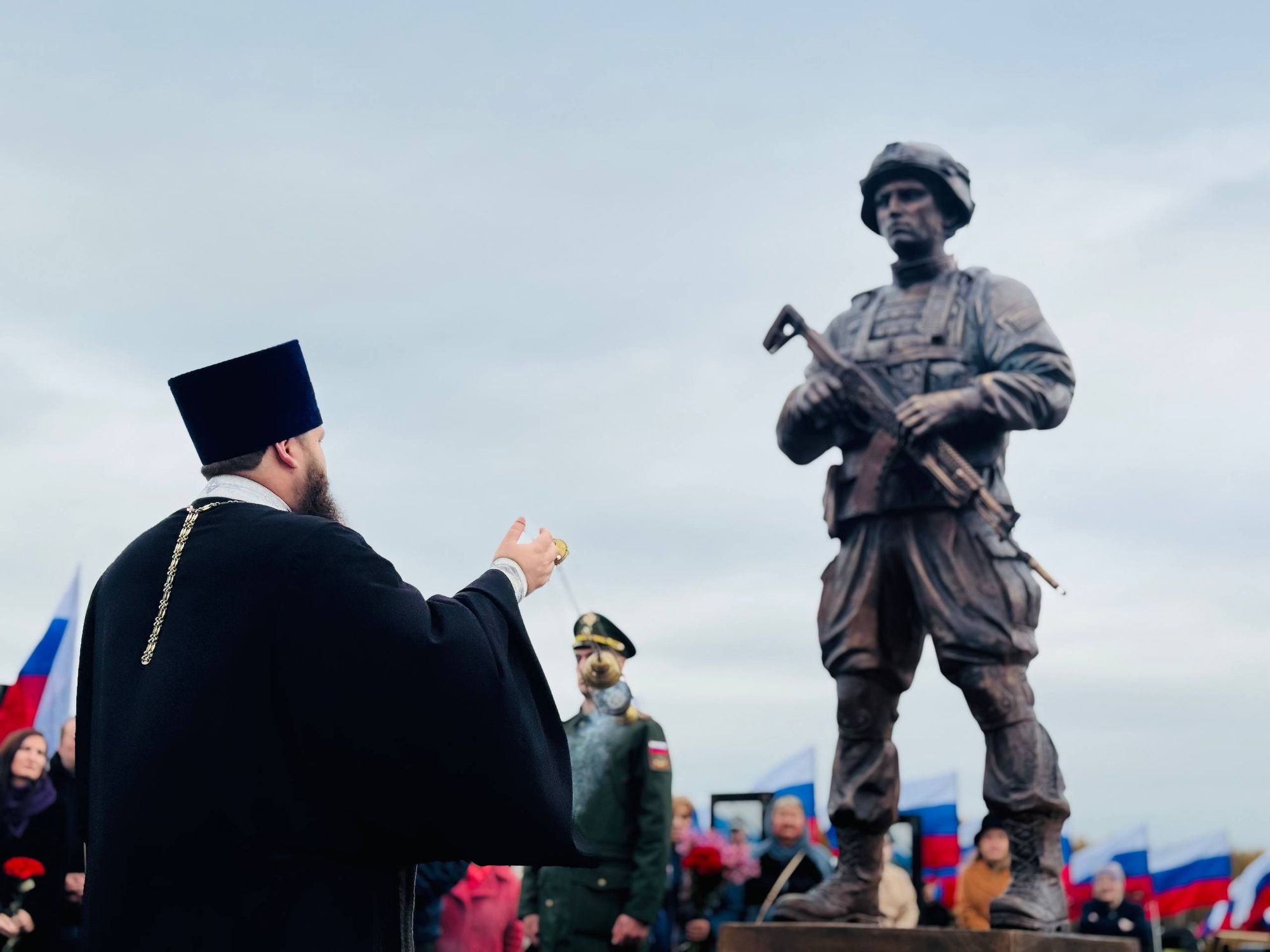 Отец Александр совершил освящение памятника воину СВО и заупокойную литию, после чего обратился к собравшимся с пастырским словом.