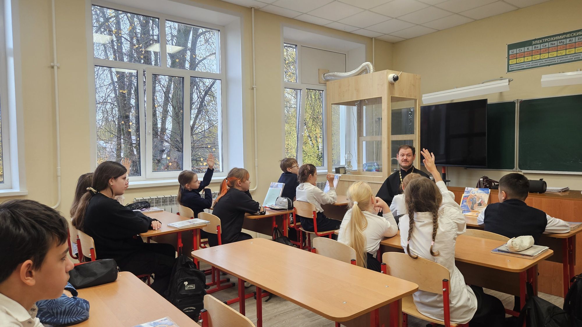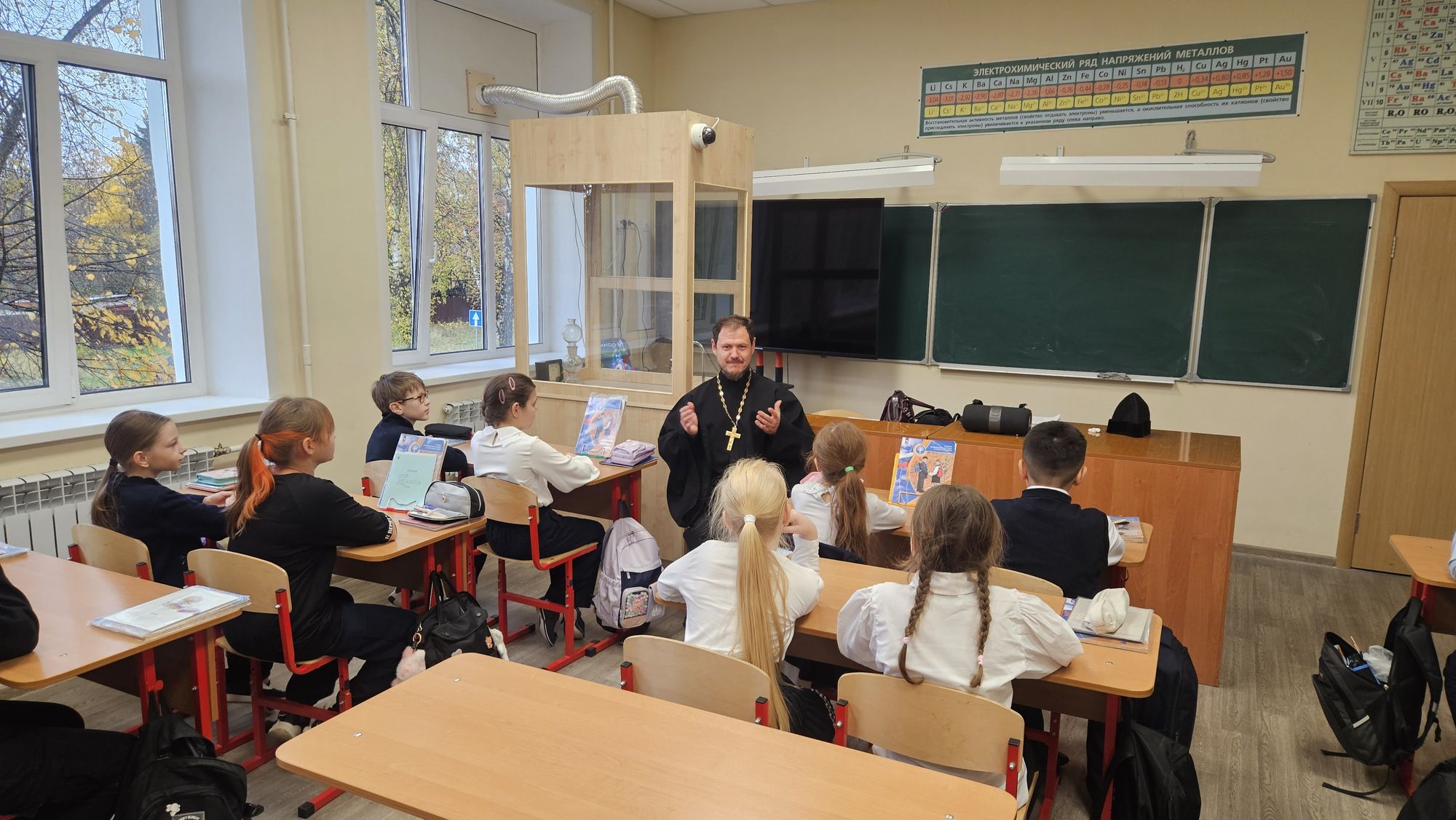 15 октября настоятель Богородицерождественского храма посёлка Образцово священник Димитрий Выдумкин провёл урок по предмету Основы православной культуры в 4 классе школы № 20 посёлка Загорянский, ответил на духовные вопросы учащихся и пригласил ребят на экскурсию в Богородицерождественский храм.