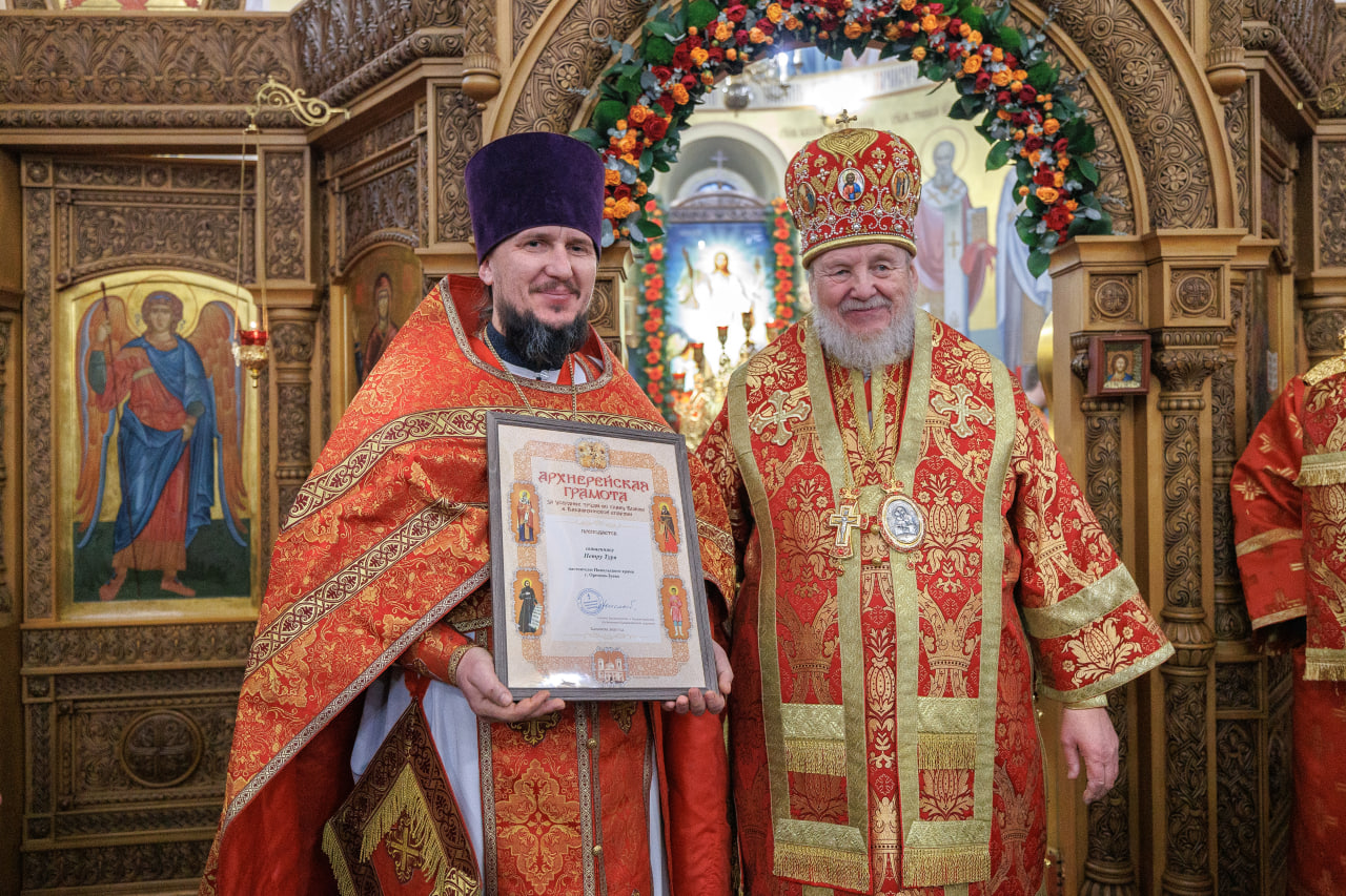 Затем Его Преосвященство обратился к сослужившему духовенству и богомольцам с архипастырским словом, после чего вручил награды Балашихинской епархии.