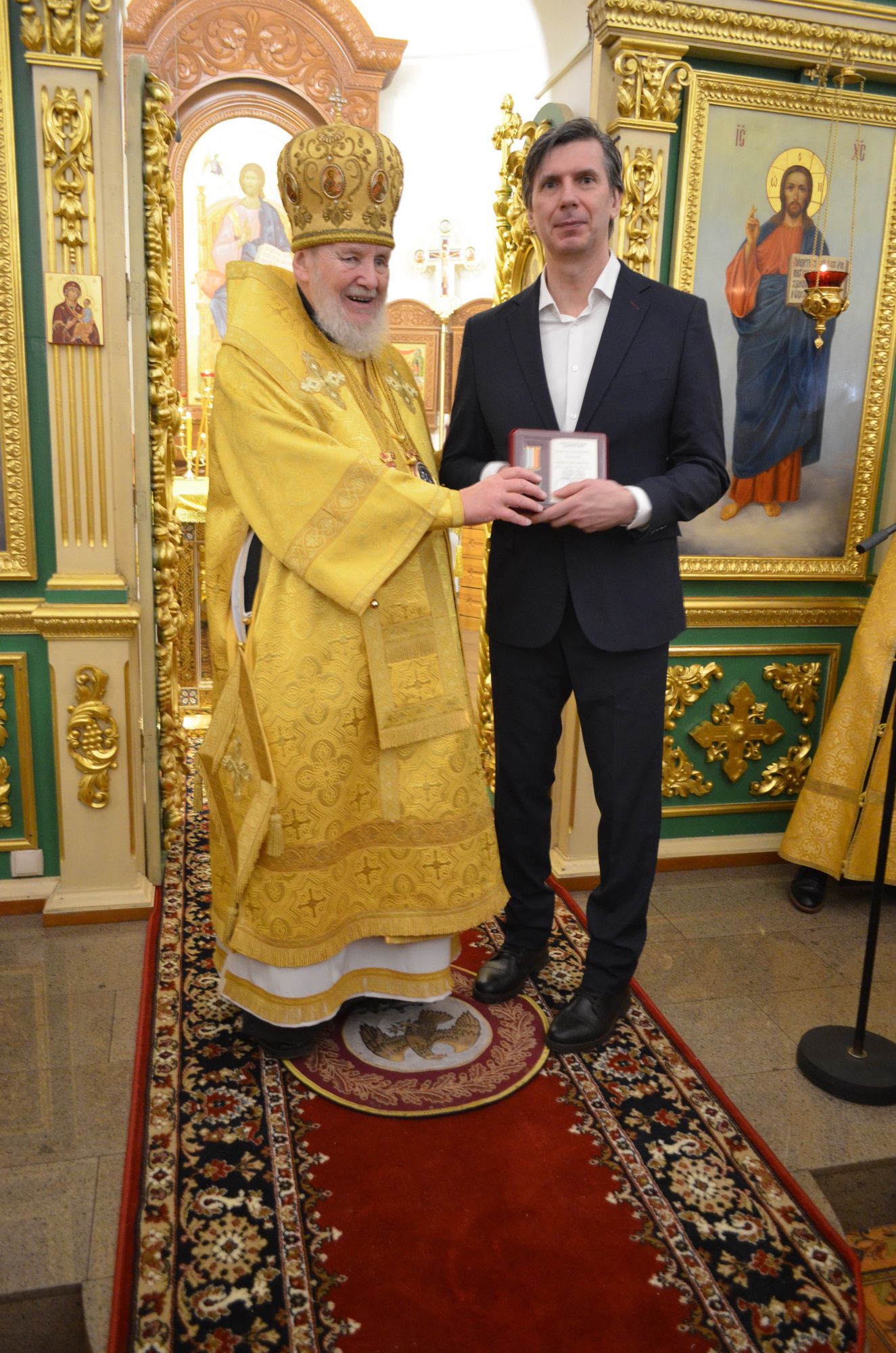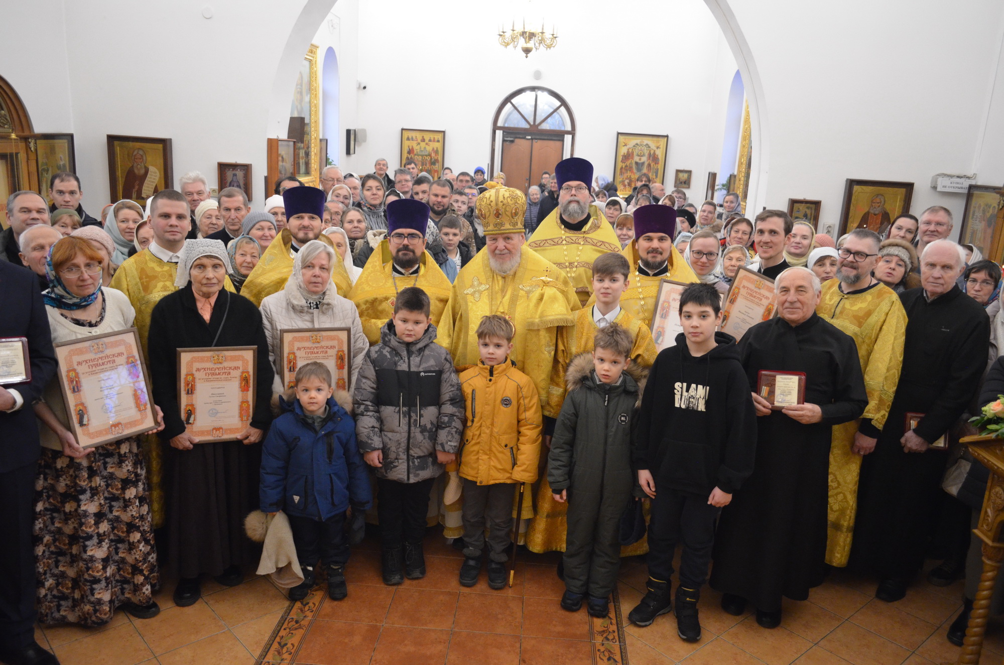 Затем Его Преосвященство обратился к духовенству и молящимся с архипастырским словом и вручил труженикам прихода награды Балашихинской епархии.