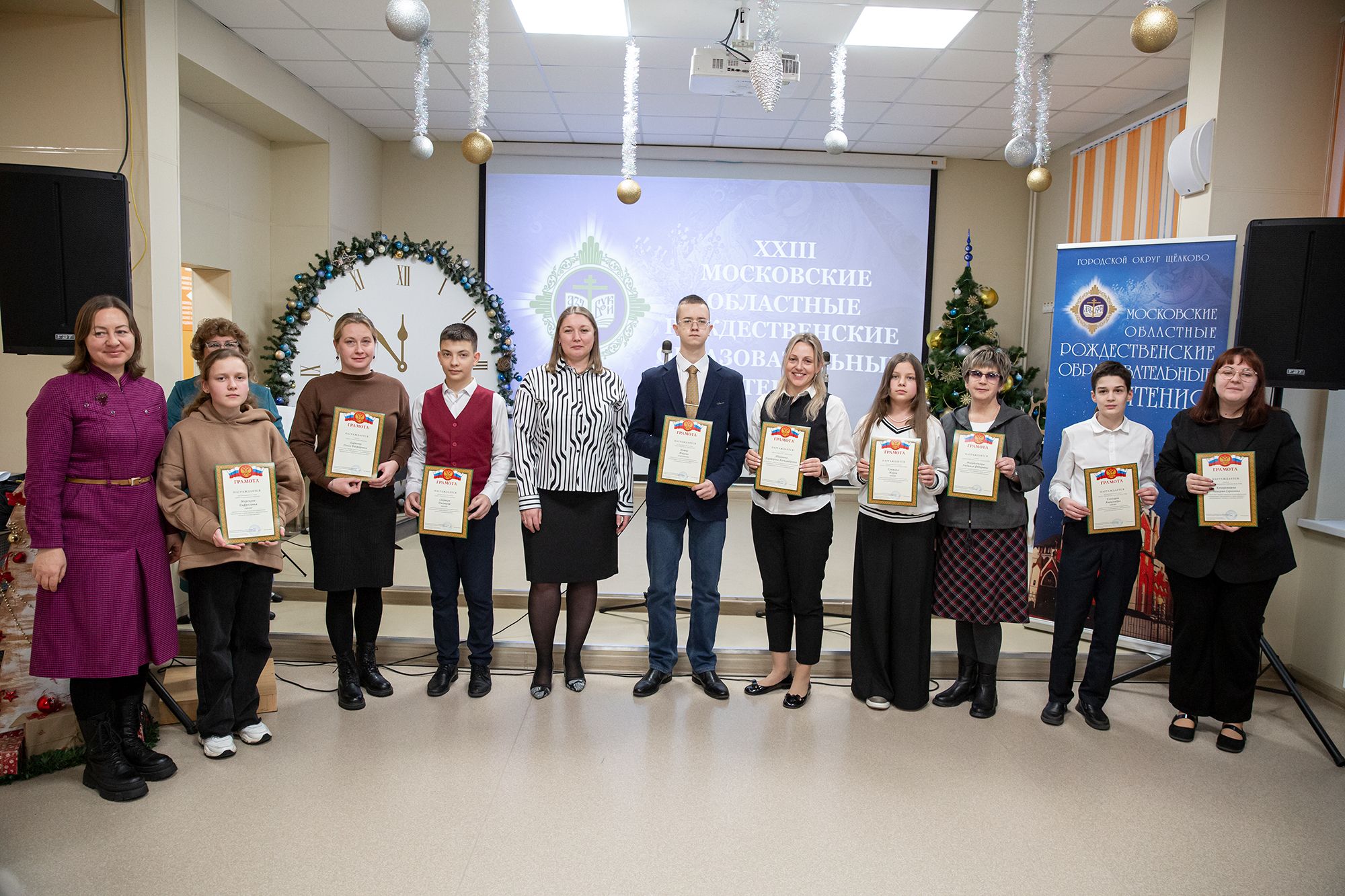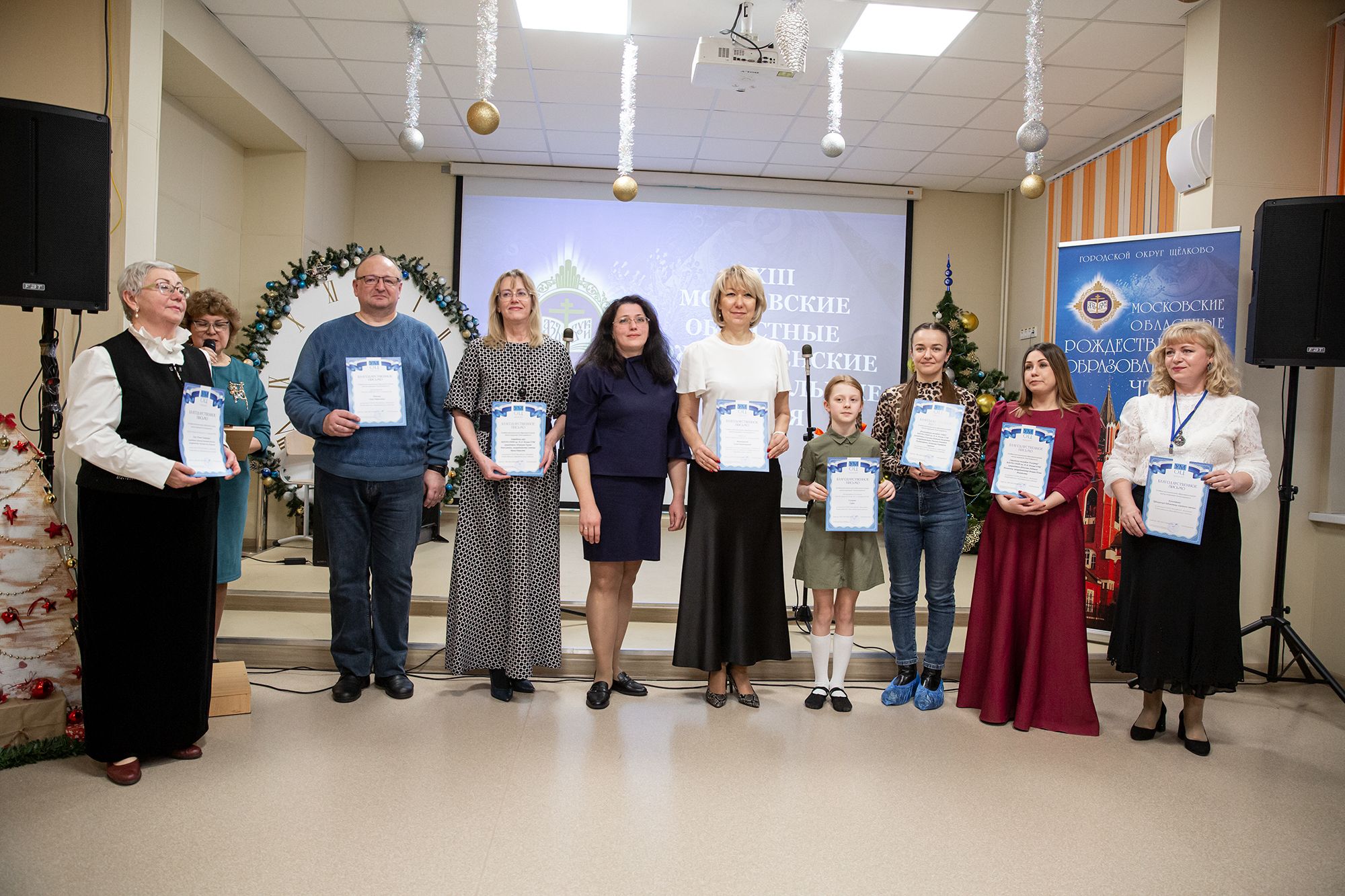 Благочинный Щёлковского церковного округа протоиерей Андрей Ковальчук и заместитель председателя Комитета по образованию администрации городского округа Щёлково Виктория Александровна Файрушина вручили педагогам и учащимся, принявшим активное участие в мероприятиях в рамках Рождественских чтений, архиерейские грамоты Балашихинской епархии, грамоты Щёлковского благочиния, грамоты комитета по образованию администрации городского округа Щёлково и памятные подарки.