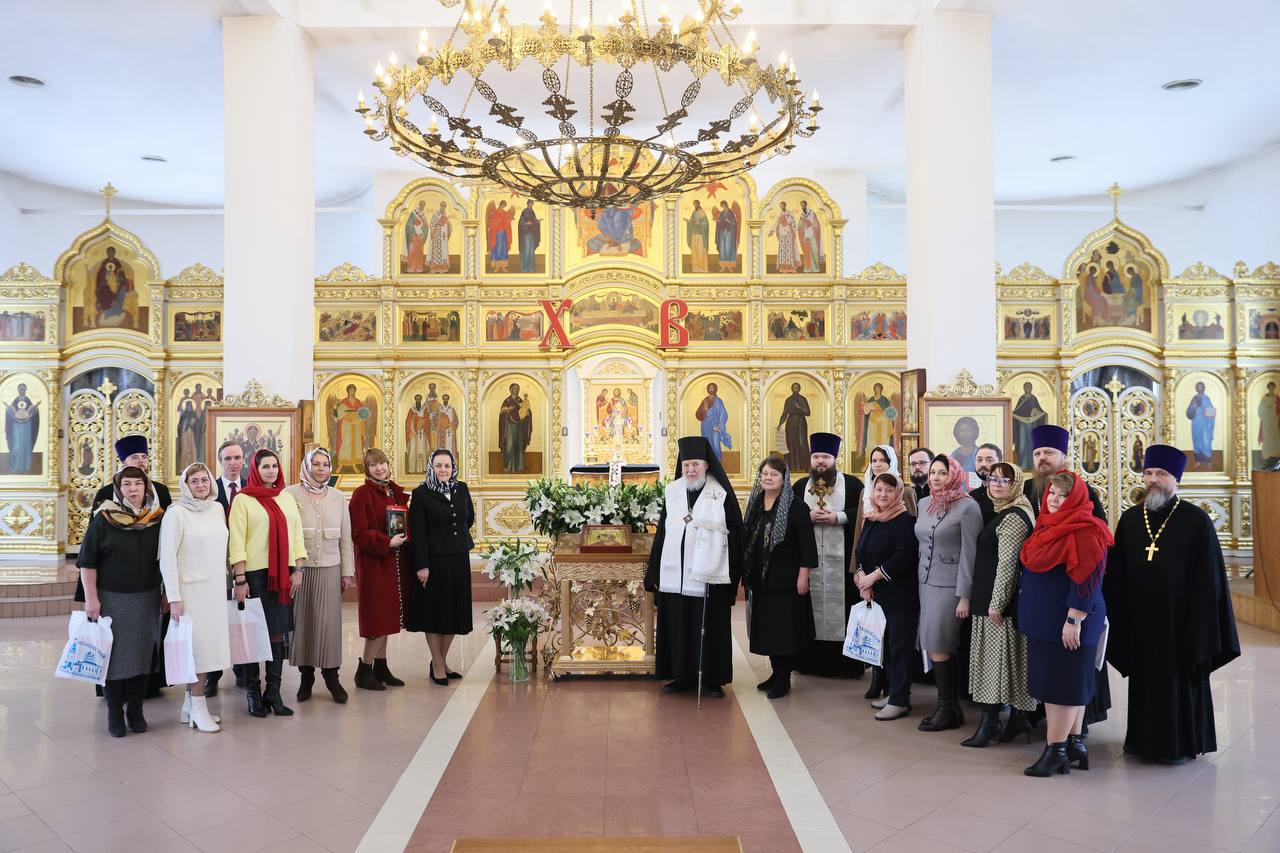 По окончании богослужения Его Преосвященство преподнёс участникам встречи памятные иконы и календари «День смыслом наполняя» Издательства Московской Патриархии.