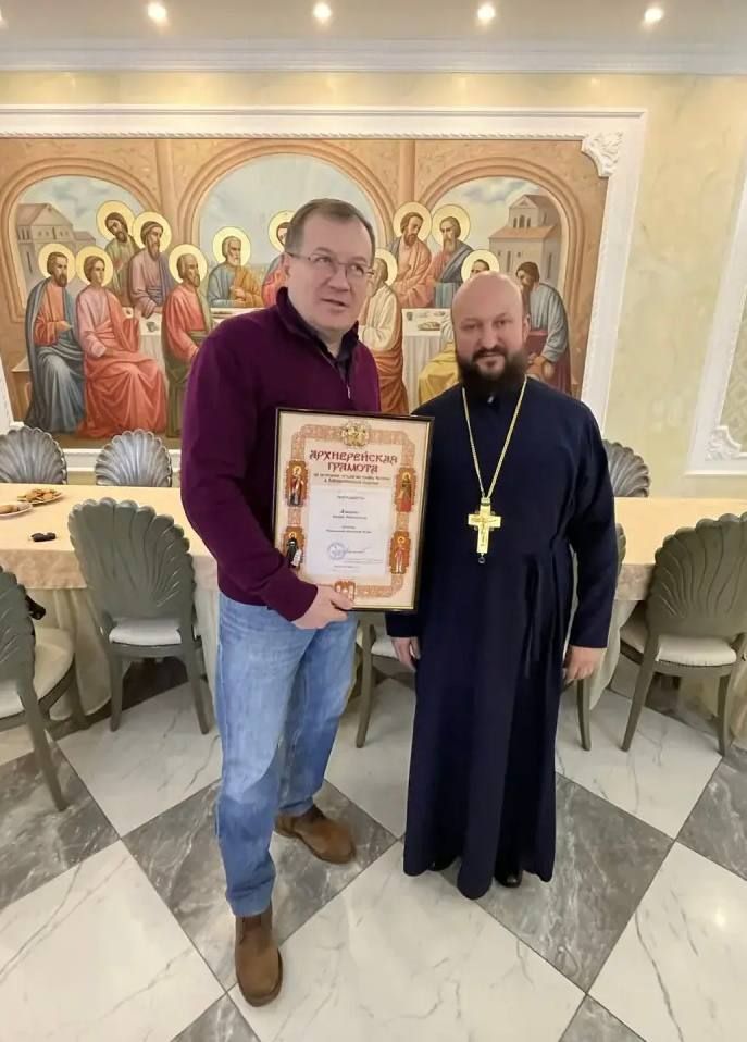 По поручению епископа Балашихинского и Орехово-Зуевского Николая отец Андрей вручил Э. Н. Живцову архиерейскую грамоту Балашихинской епархии за вклад в церковно-общественную и просветительскую деятельность.